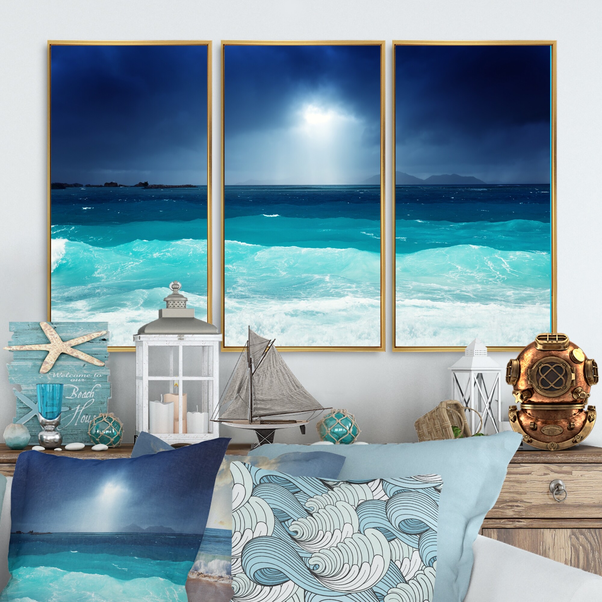 Designart "Neon Sea Waves under Dark Sky" Sea & Shore Framed Art Prints Set of 3 - 4 Colors of Frames