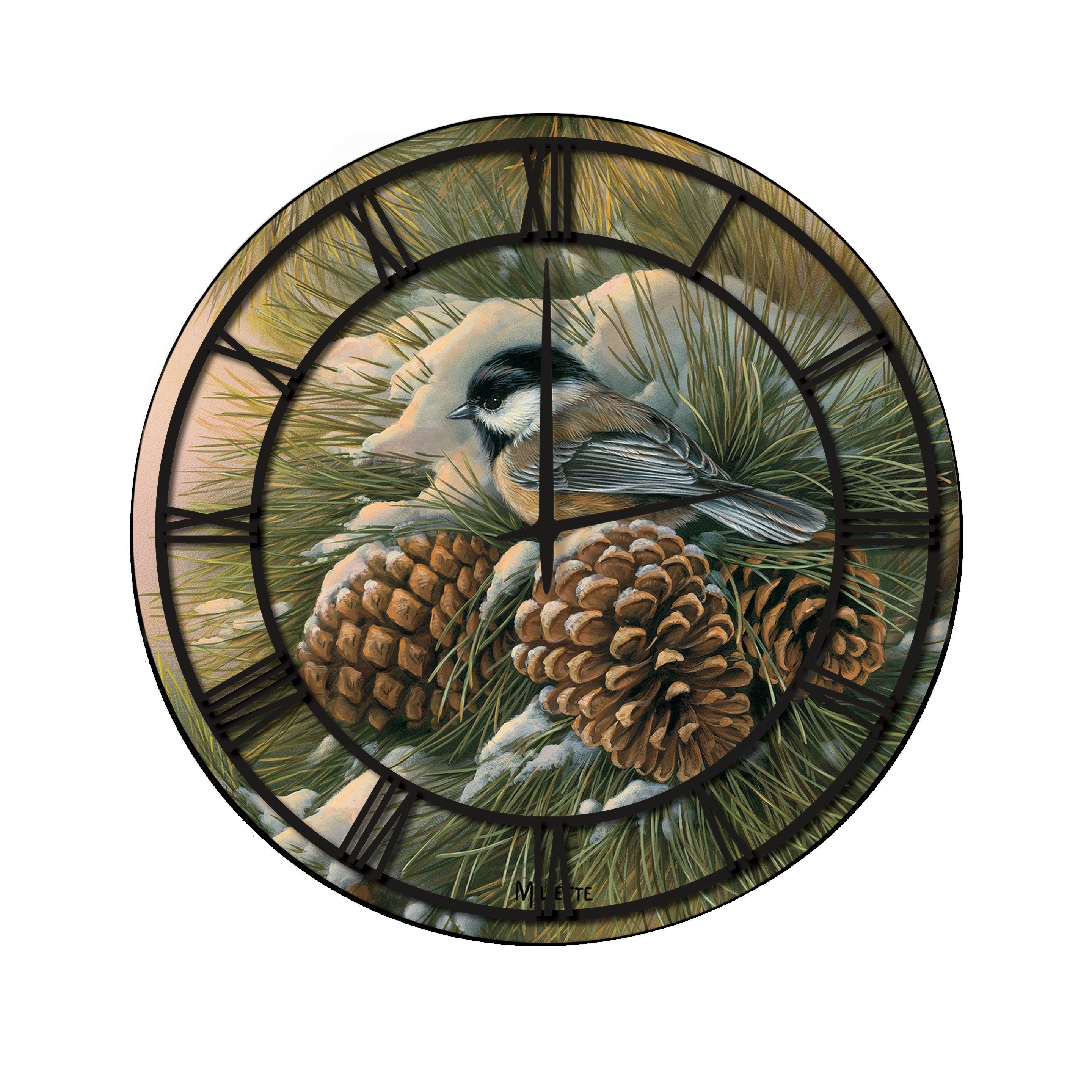 Wall Clock with Full Coverage Art - December Dawn Chickadee - Black Numbers - 24" x 24"