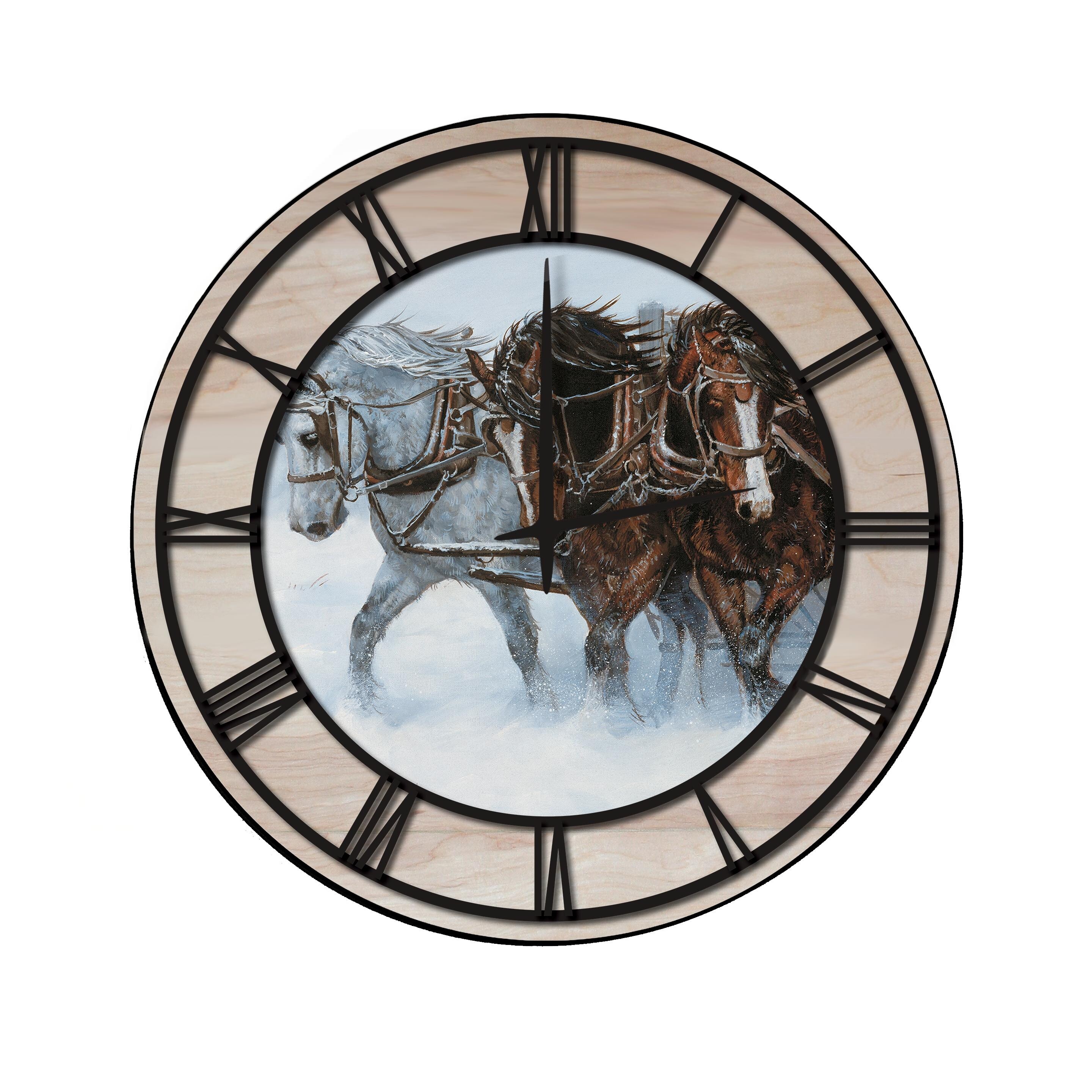 Wall Clock with Natural Woodgrain Accent - Winter Wind Horses - Black Numbers - 24" x 24"