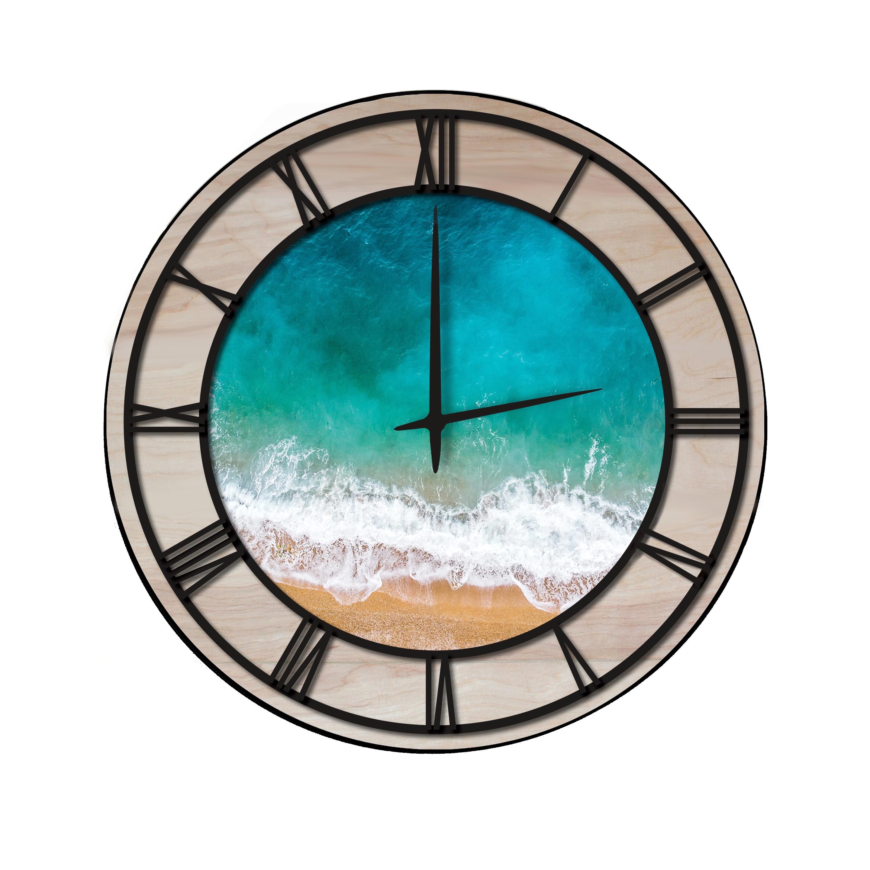 Wall Clock with Natural Woodgrain Accent - Beach Waves - Black Numbers - 24" x 24"