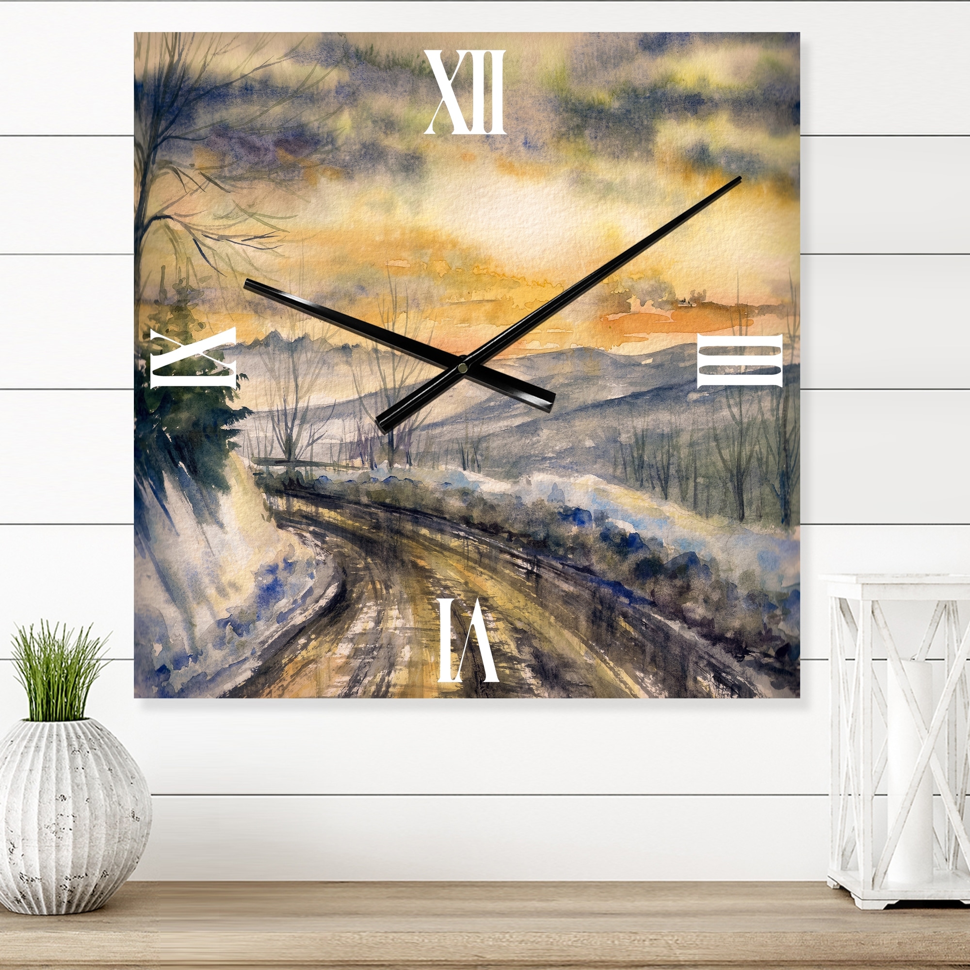 Designart 'Winter Landscape With Road Under Bright Sunset' Traditional Wall Clock Decor