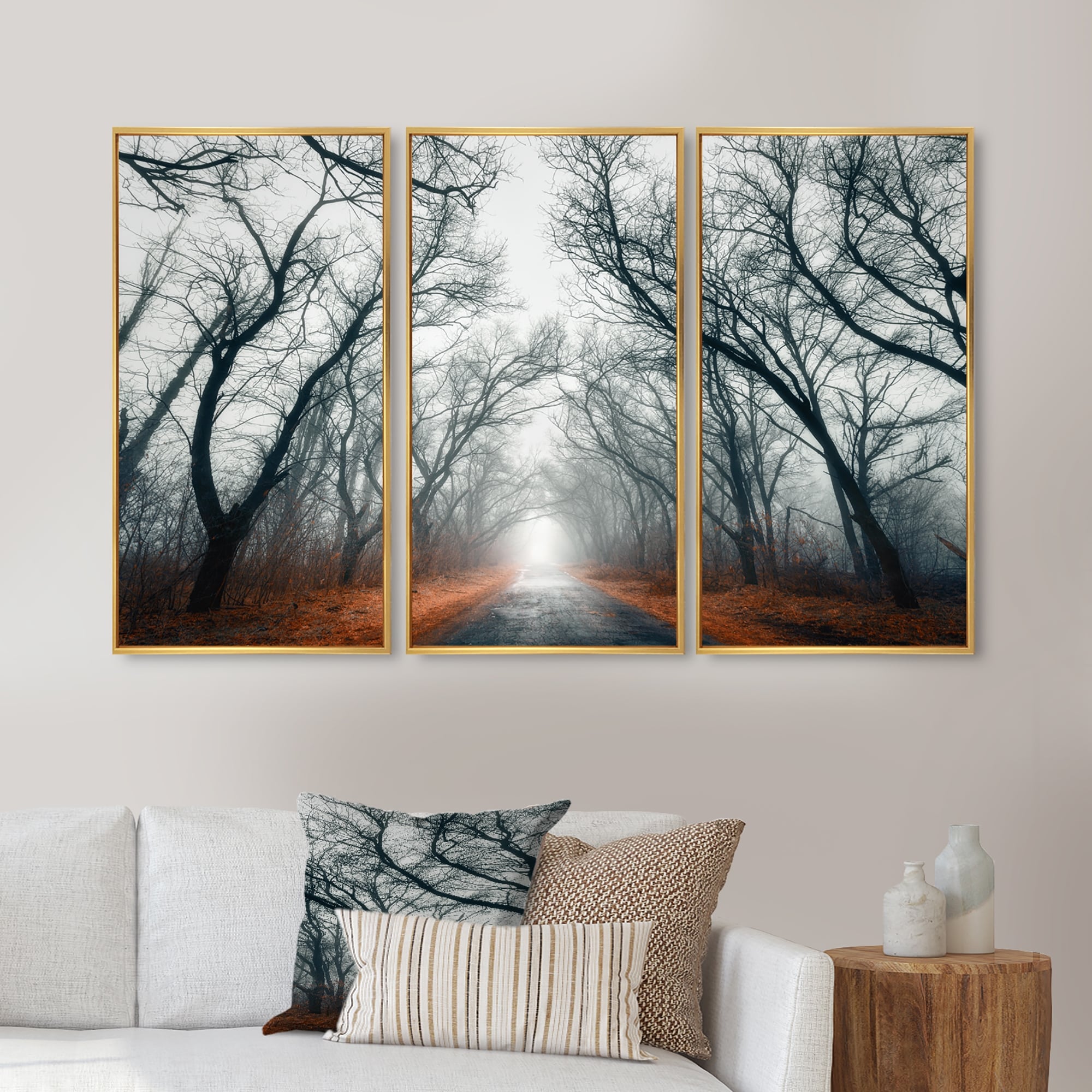 Designart "Country Road Between Foggy Trees" Forest Framed Art Set of 3 - 4 Colors of Frames