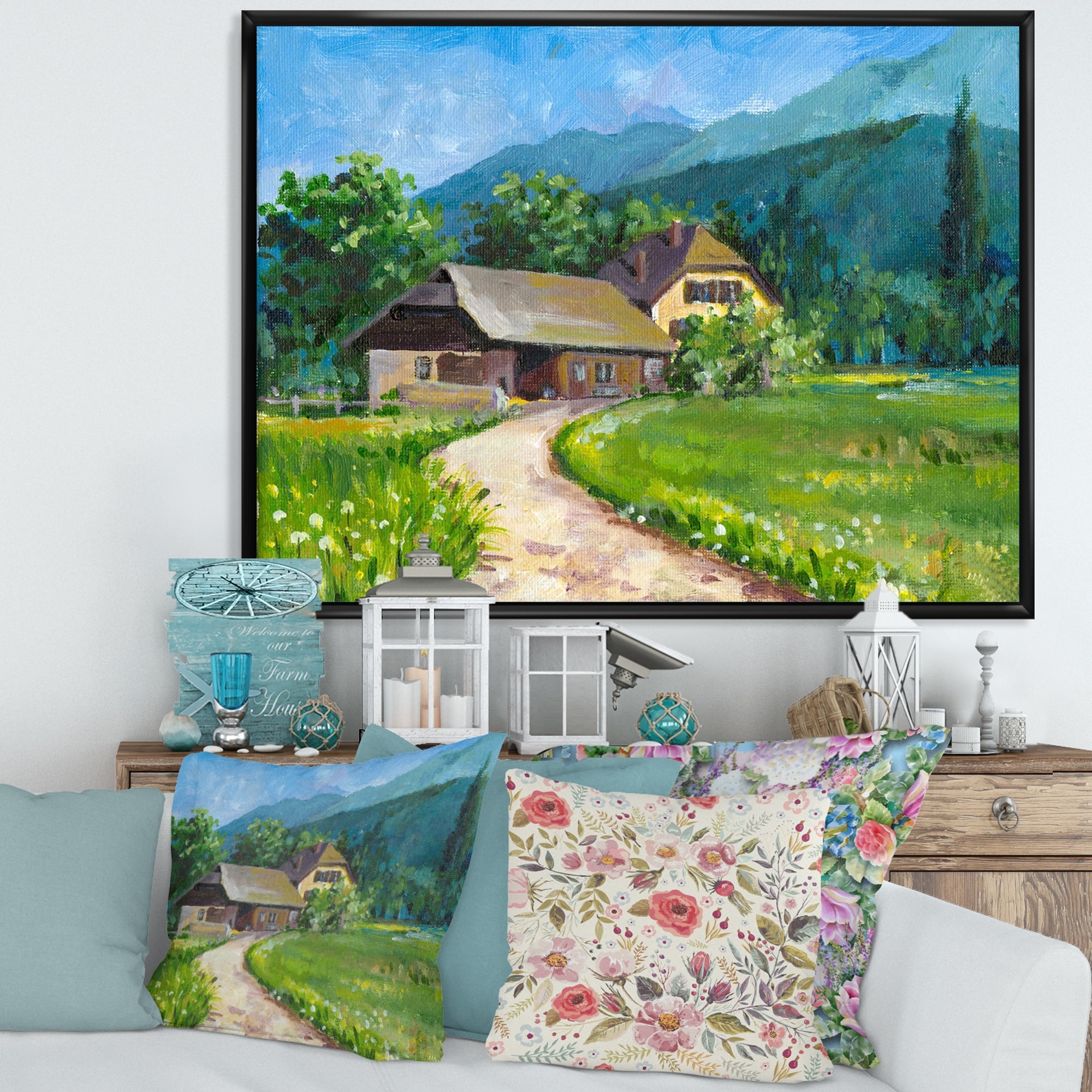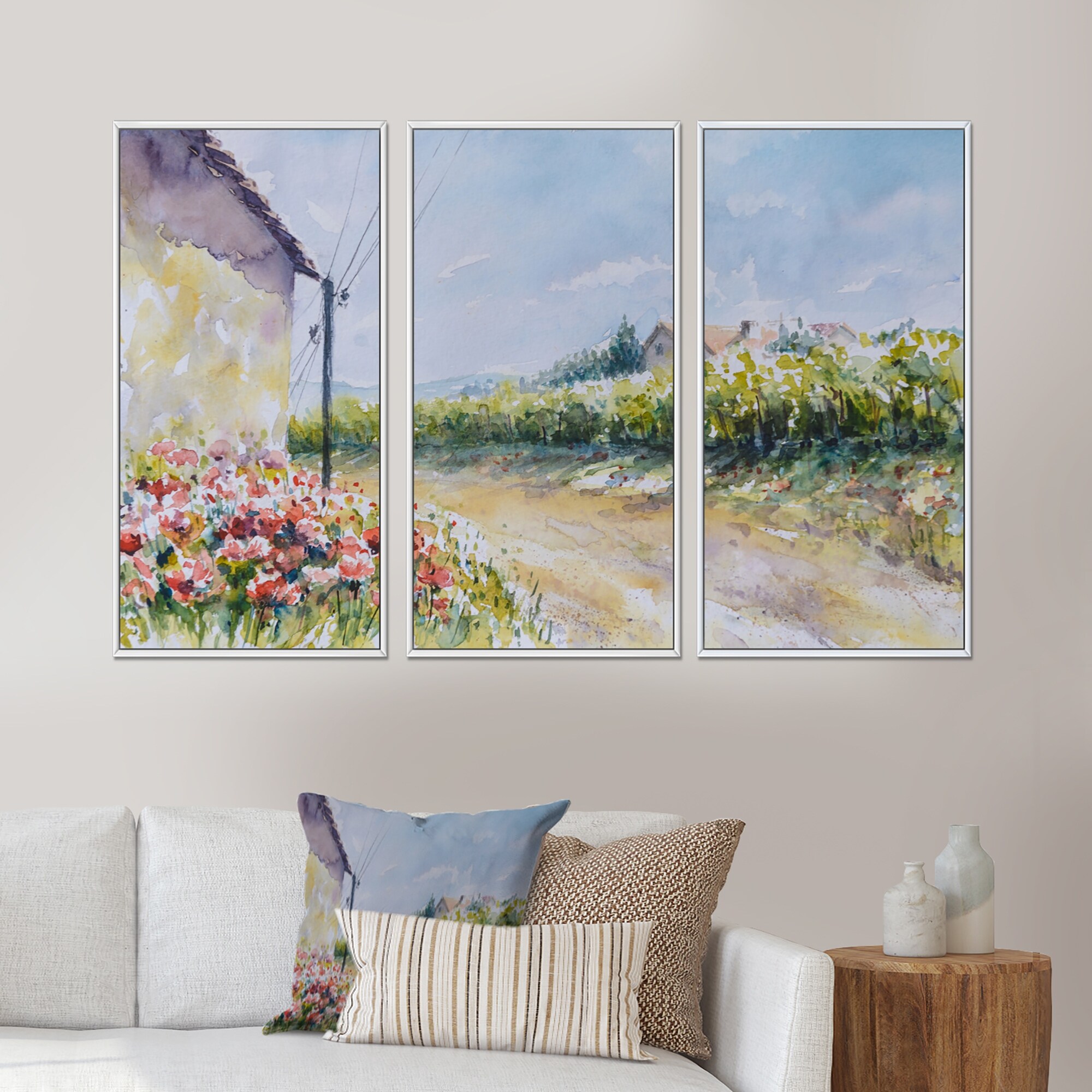 Designart "Countryside With Old House Close to the Road" Country Framed Canvas Wall Art Print Set of 3 - 4 Colors of Frames