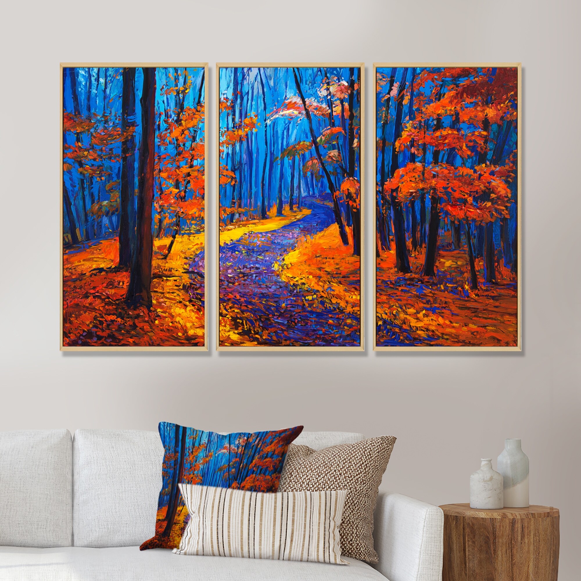 Designart "Little Road Through Red Autumn Landscape" Traditional Framed Canvas Wall Art Set of 3 - 4 Colors of Frames