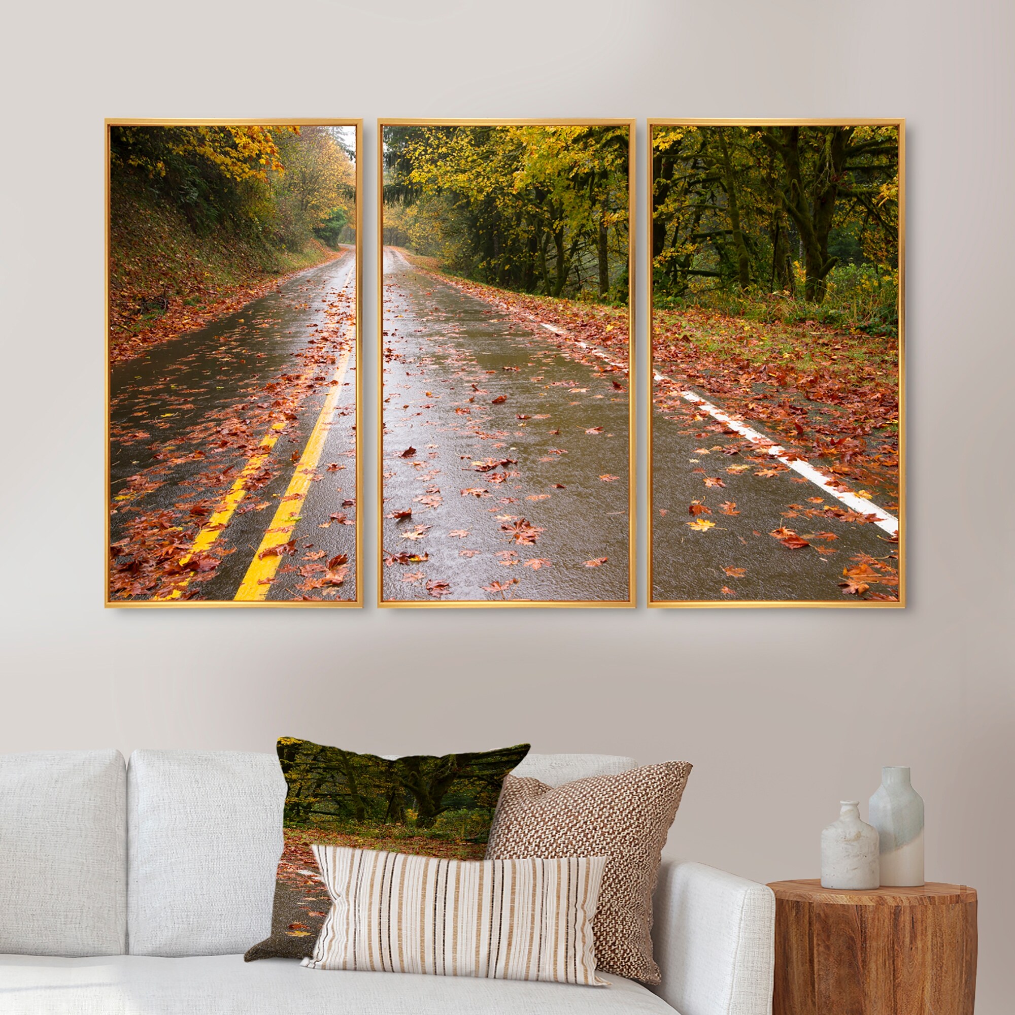 Designart "Wet Rainy Road in Forest" Landscape Framed Canvas Wall Art Print Set of 3 - 4 Colors of Frames