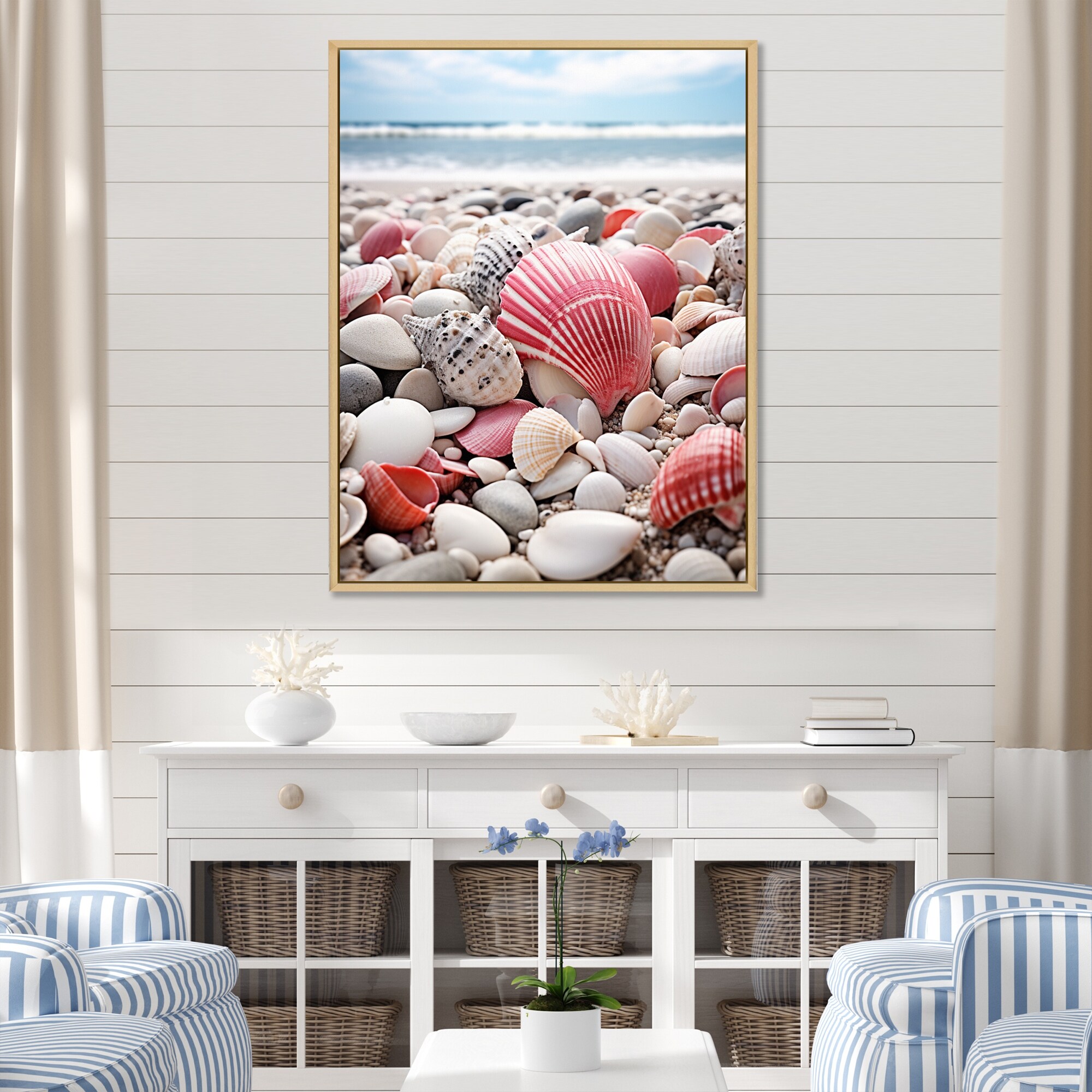 Designart "Pink Beige Seashell on the Beach" Coastal Beach Sand Framed Wall Art Living Room