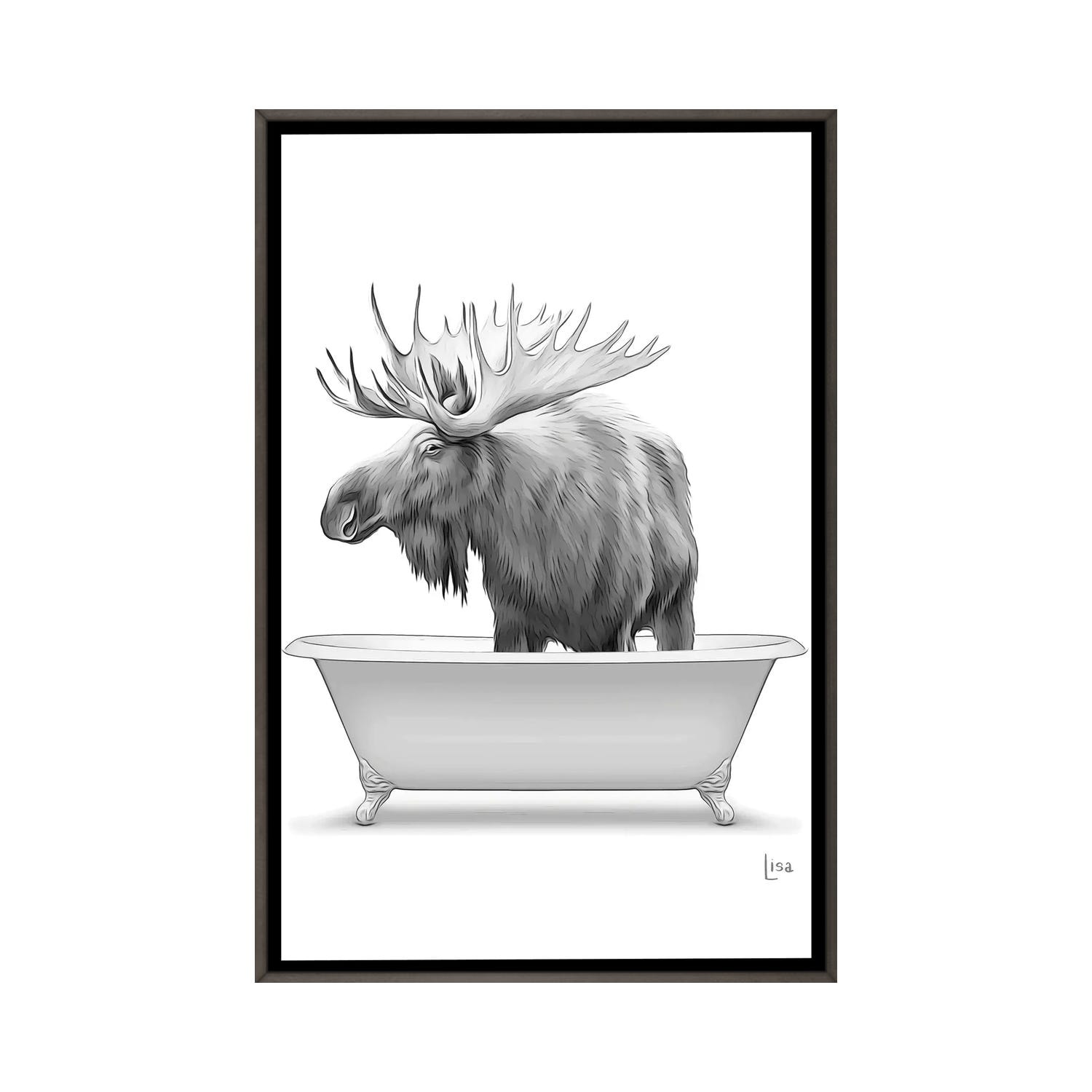 iCanvas "Moose In Bathtub Black And White" by Printable Lisa's Pets Framed