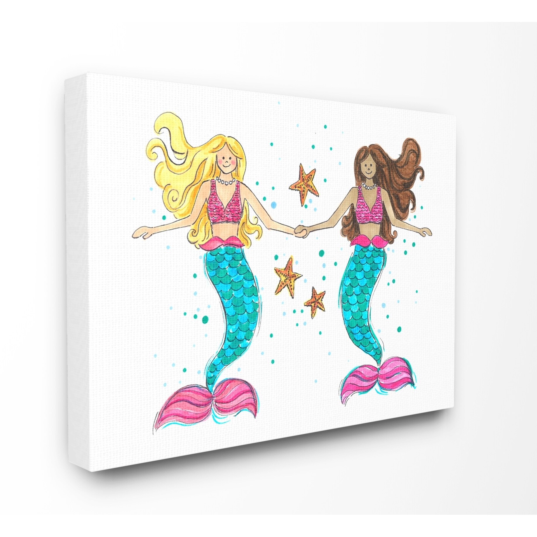 The Kids Room By Stupell Two Blue and Pink Mermaid Friends with Starfish Canvas Wall Art, 16 x 20, Proudly Made in USA
