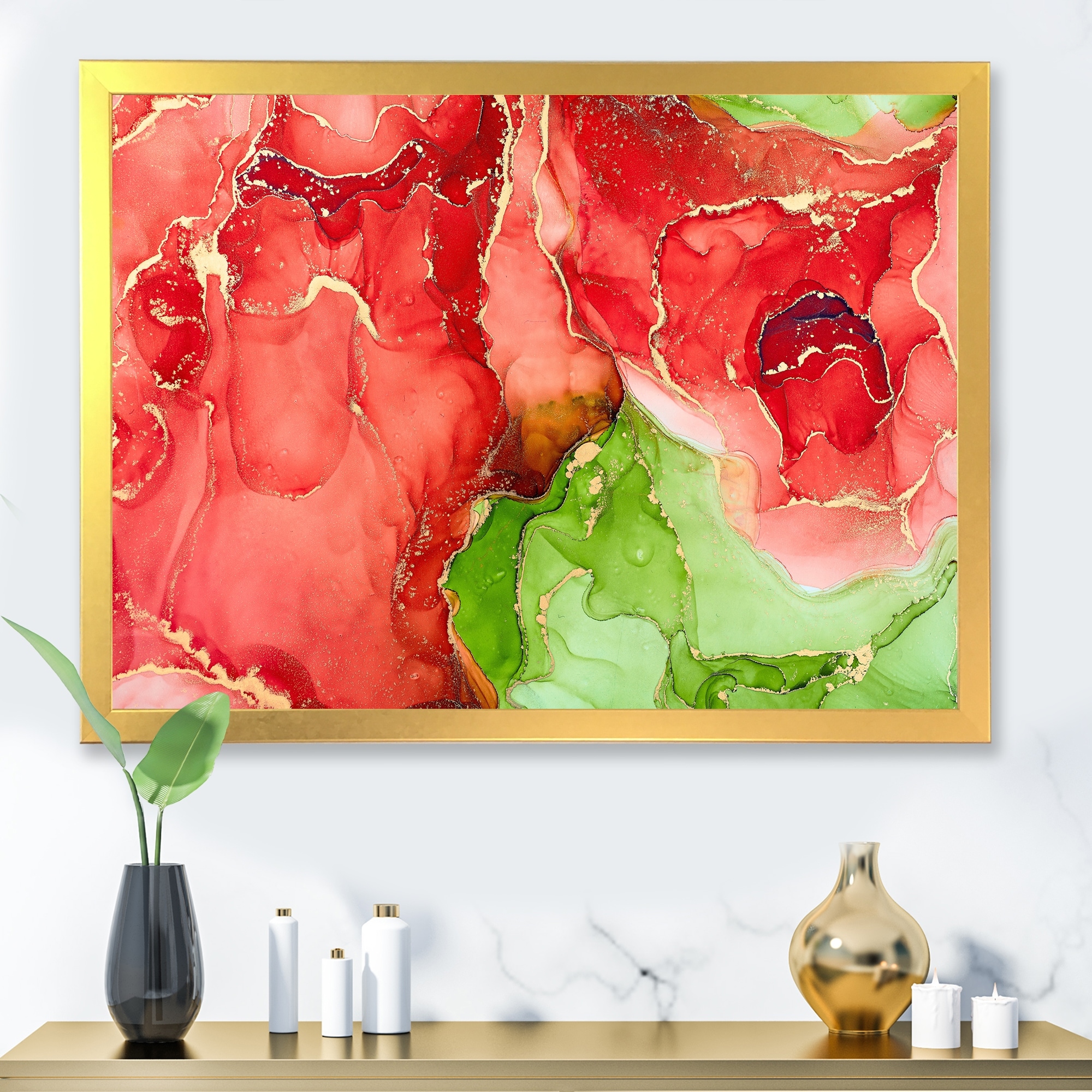 Designart "Red And Green Luxury Abstract Fluid Art" Modern Framed Art Print