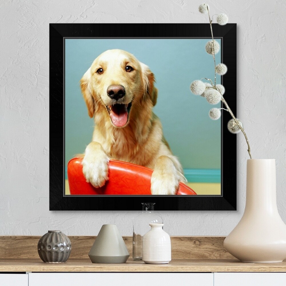 "Happy Golden Retriever on a red chair" Black Framed Print
