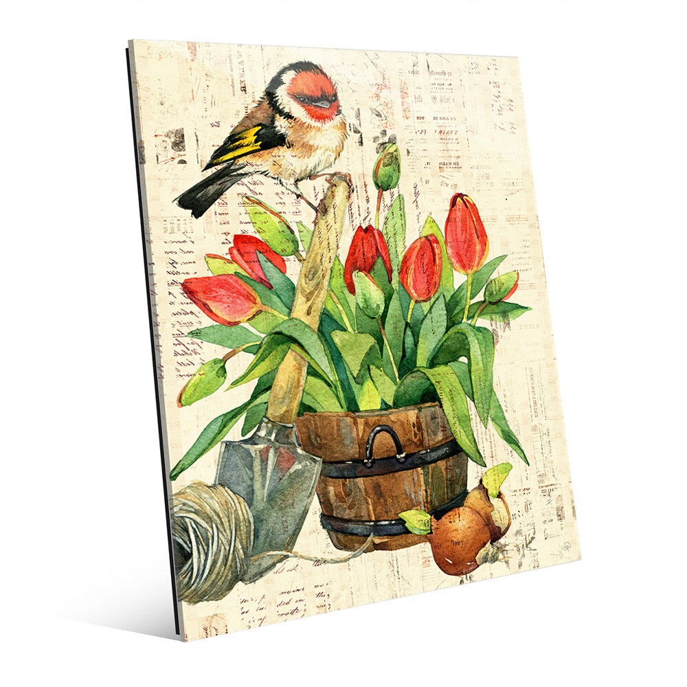 Garden Bird and Red Tulips Canvas Wall Art Print