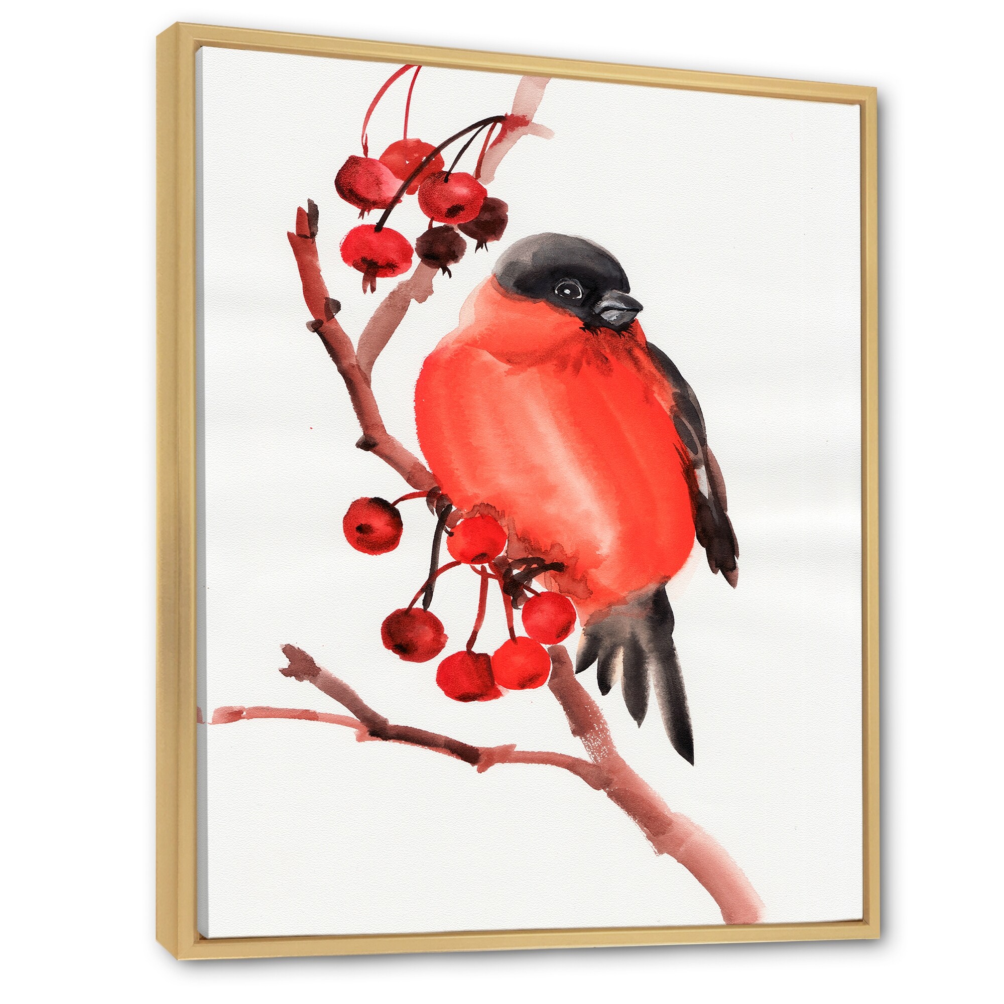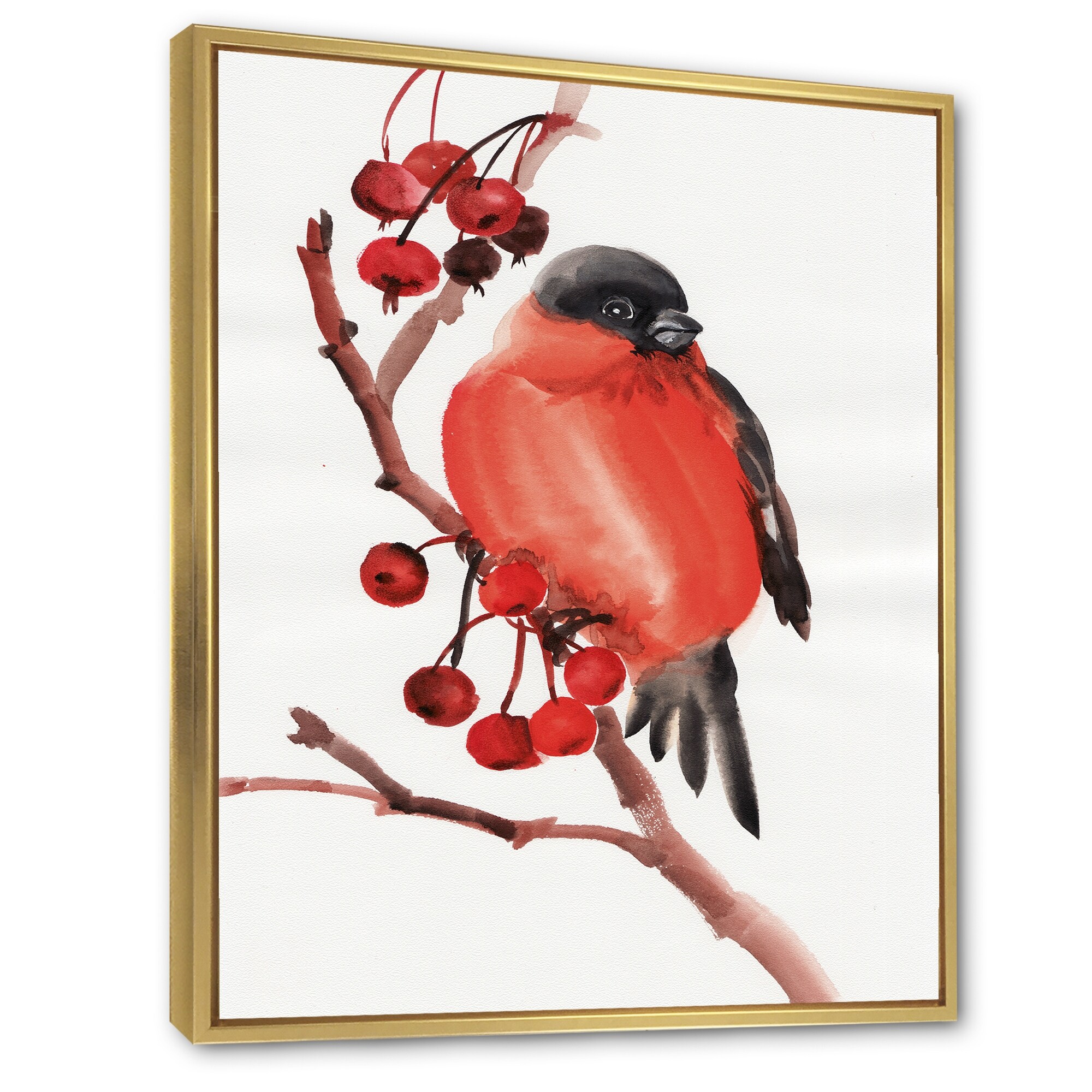 Designart "Red Bullfinch Bird on A Branch With Berries" Traditional Framed Canvas Wall Art Print