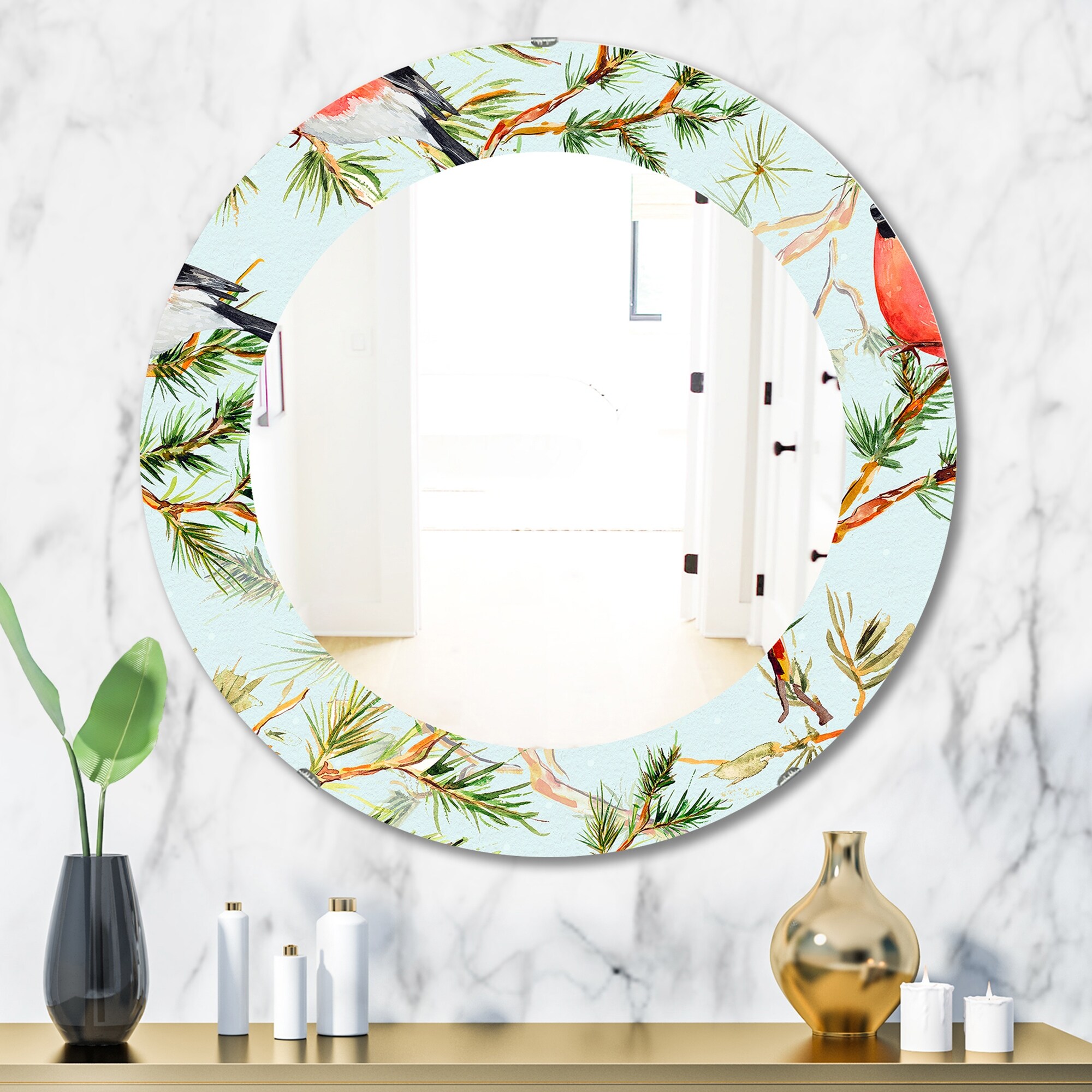 Designart 'Little Bird With Red Chest on Pine Branch' Printed Traditional Oval or Round Wall Mirror
