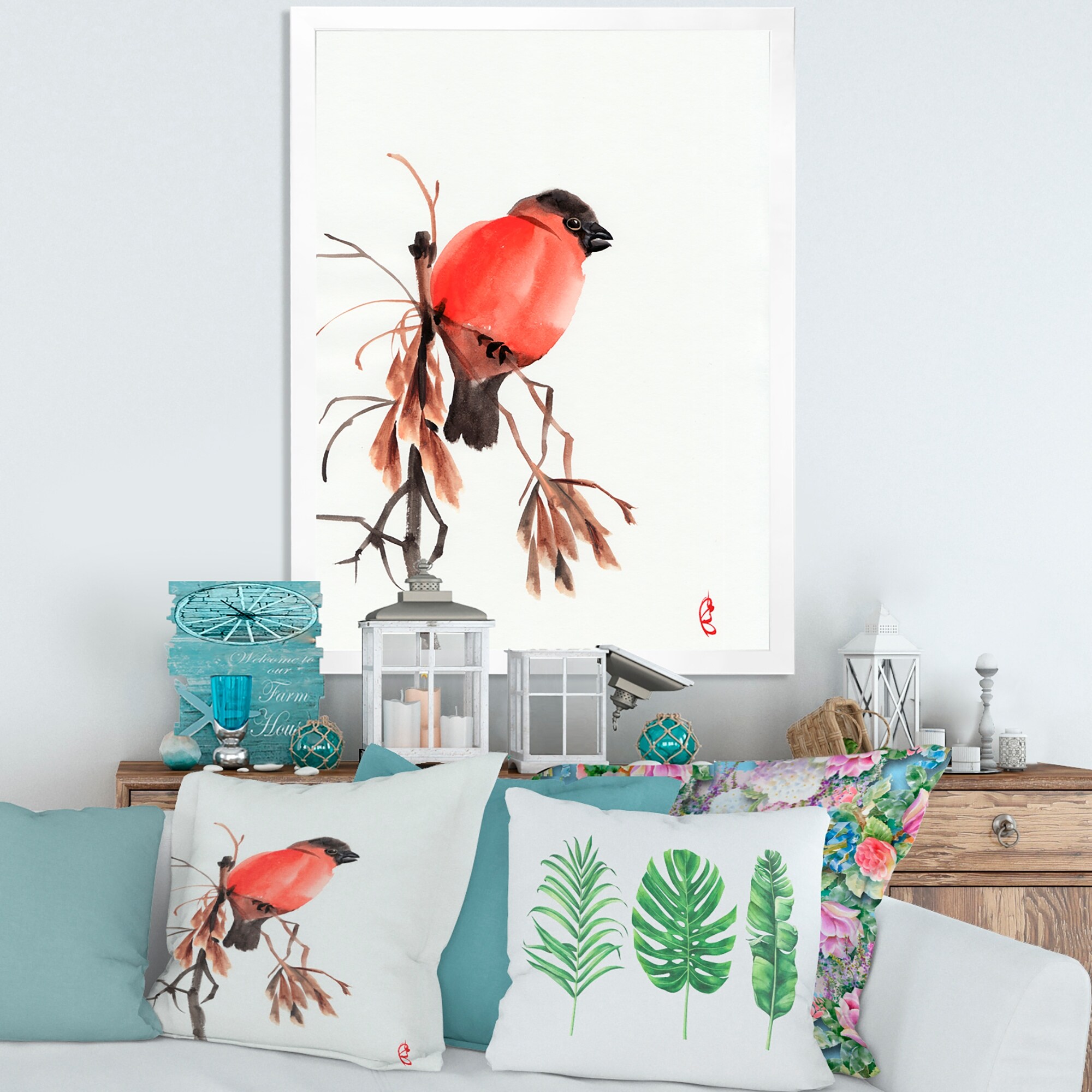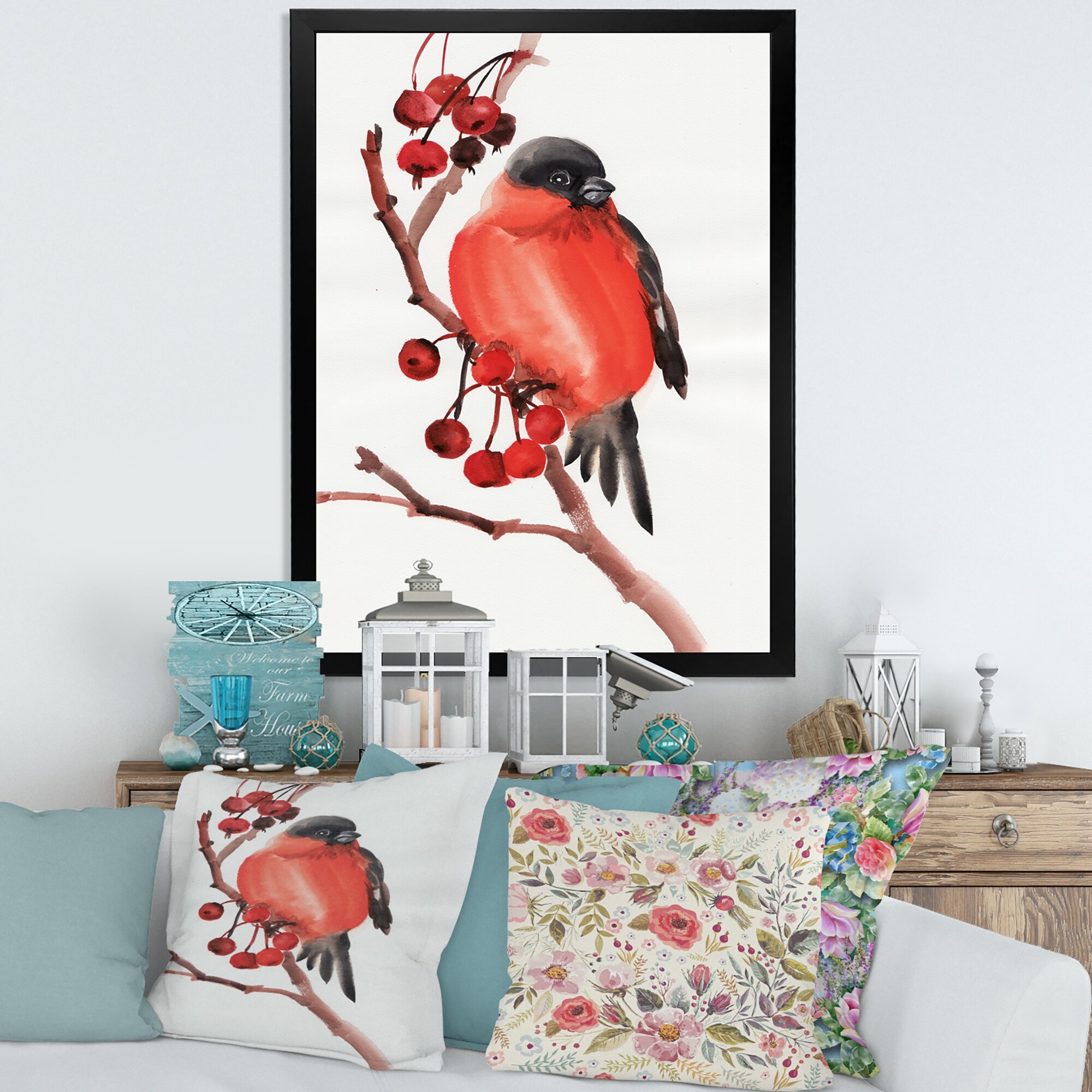 Designart "Red Bullfinch Bird on A Branch" Traditional Framed Art Print