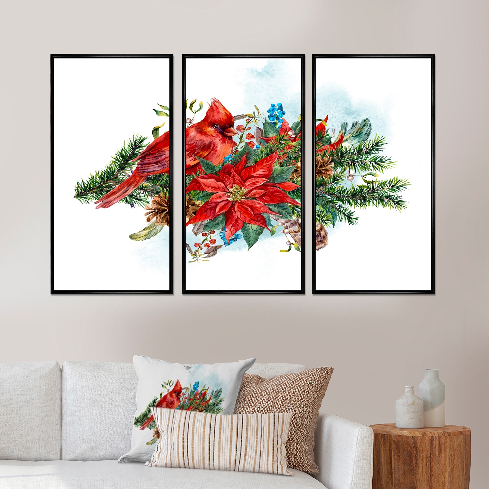 Designart "Christmas Poinsettia and Red Cardinal Bird" Traditional Framed Artwork Set of 3 - 4 Colors of Frames