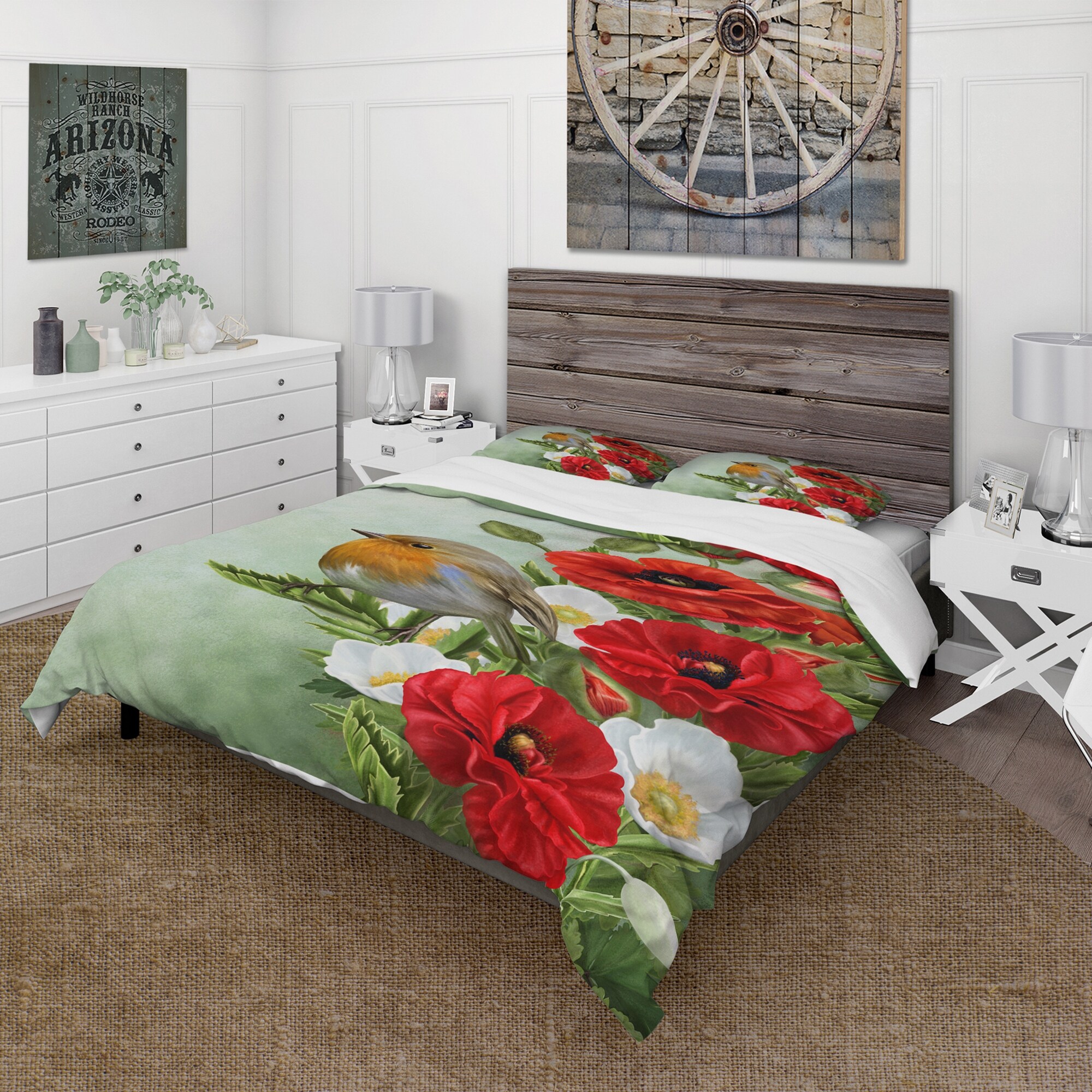 Designart 'Yellow Bird With Red Poppies and White Anemones' Traditional Duvet Cover Set