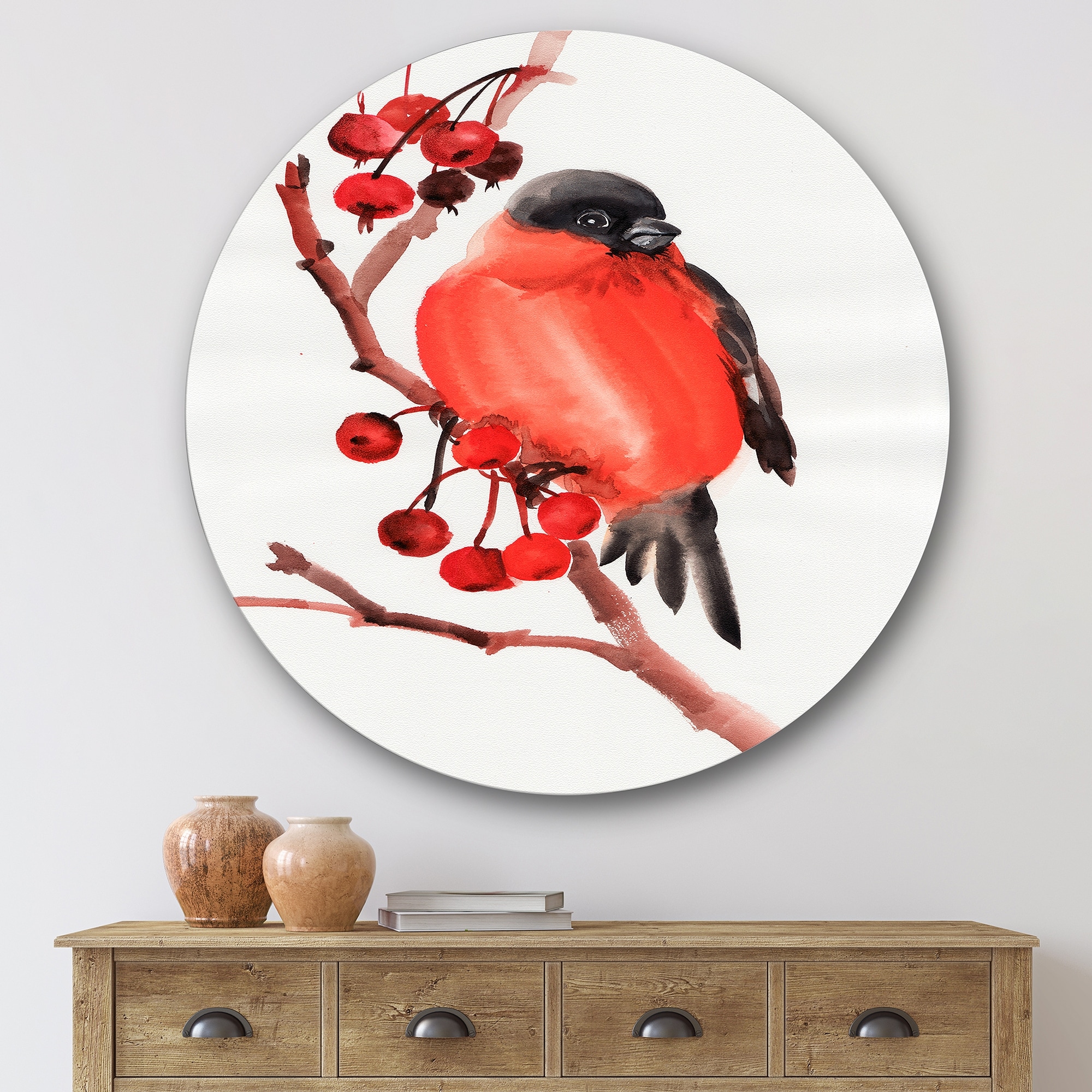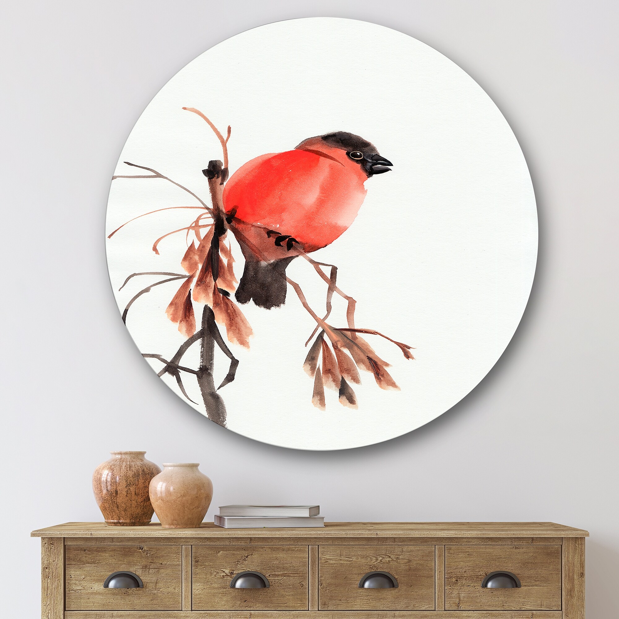 Designart 'Red Bullfinch Bird on A Branch' Traditional Metal Circle Wall Art
