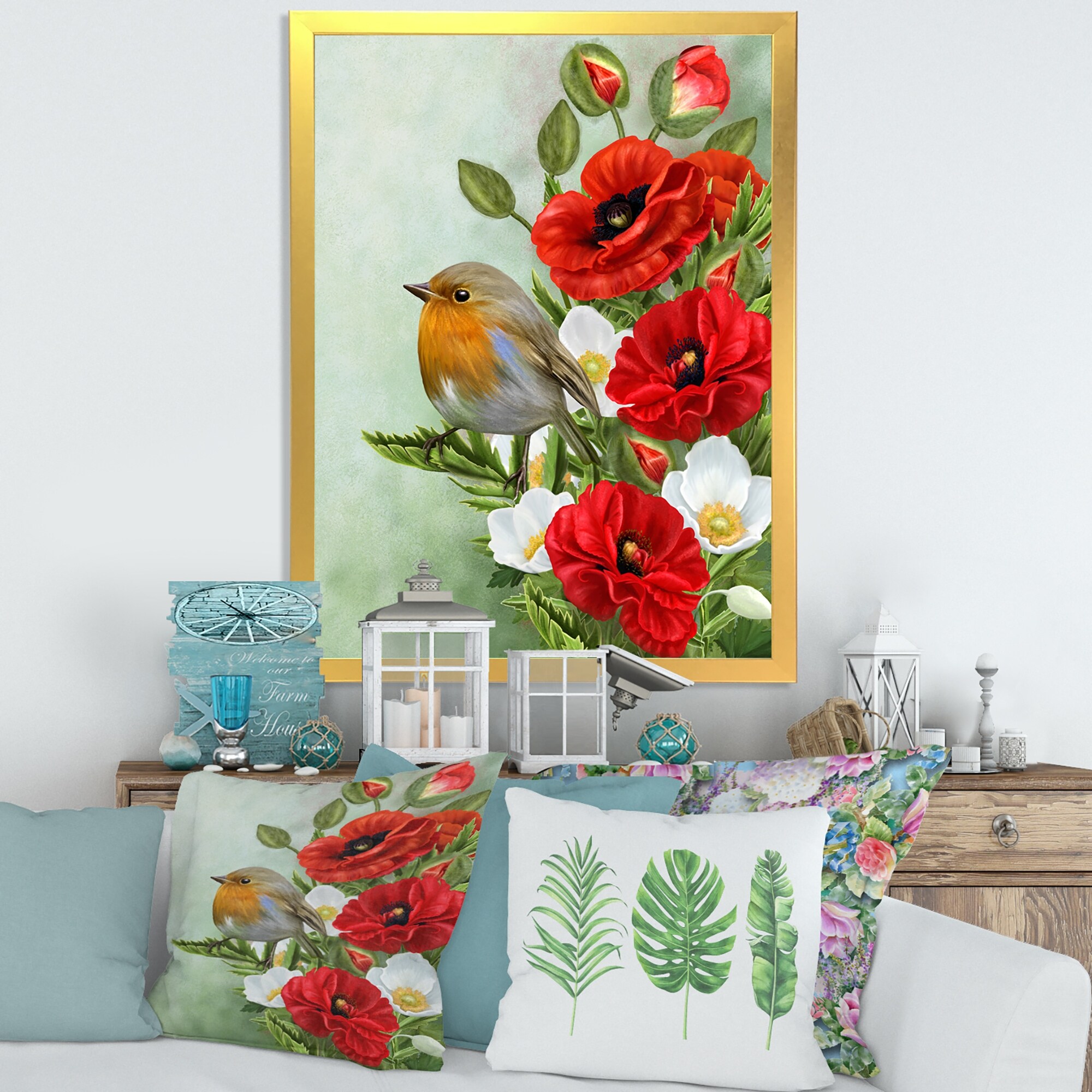 Designart "Yellow Bird With Red Poppies and White Anemones" Traditional Framed Art Print