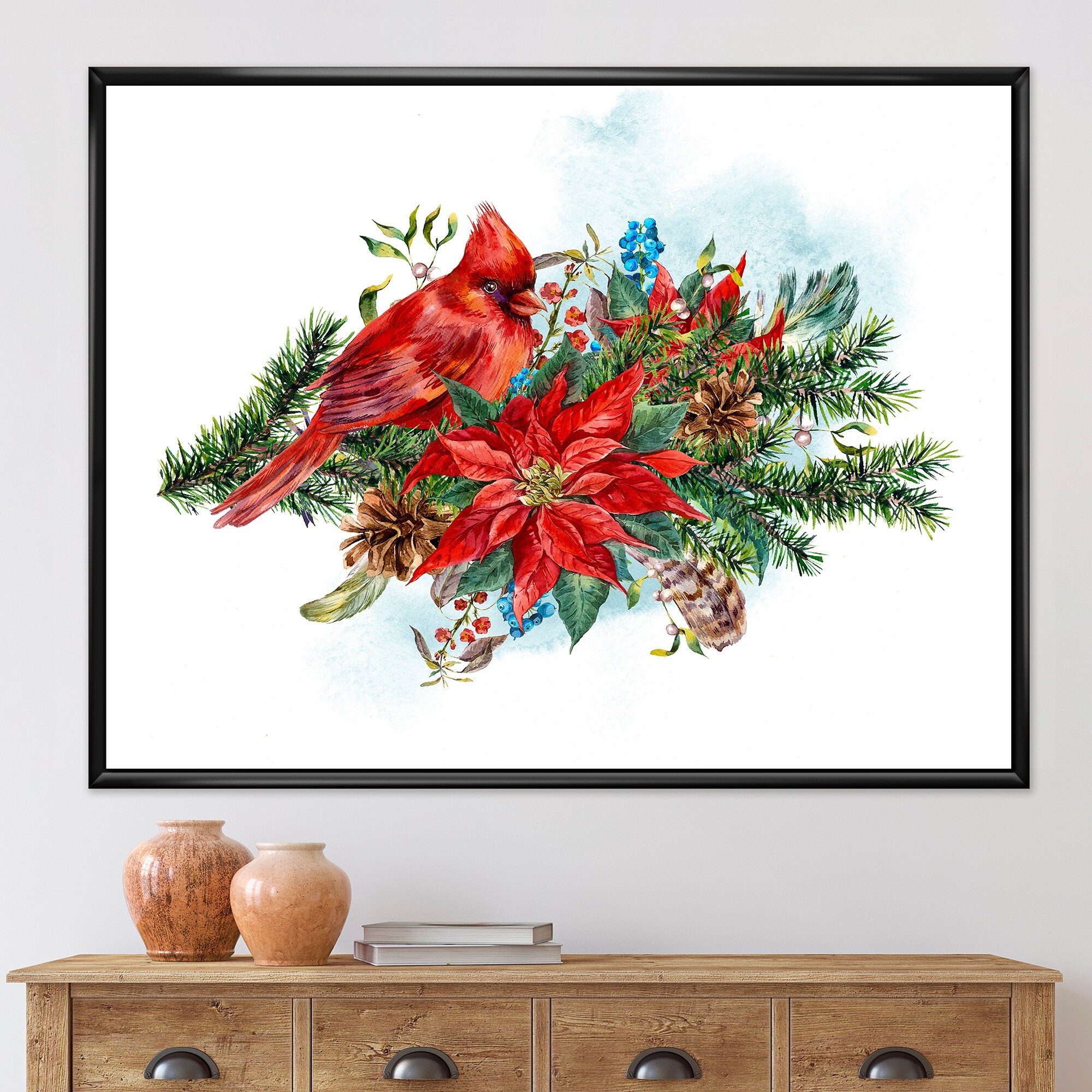 Designart "Christmas Poinsettia and Red Cardinal Bird" Traditional Framed Canvas Wall Art Print