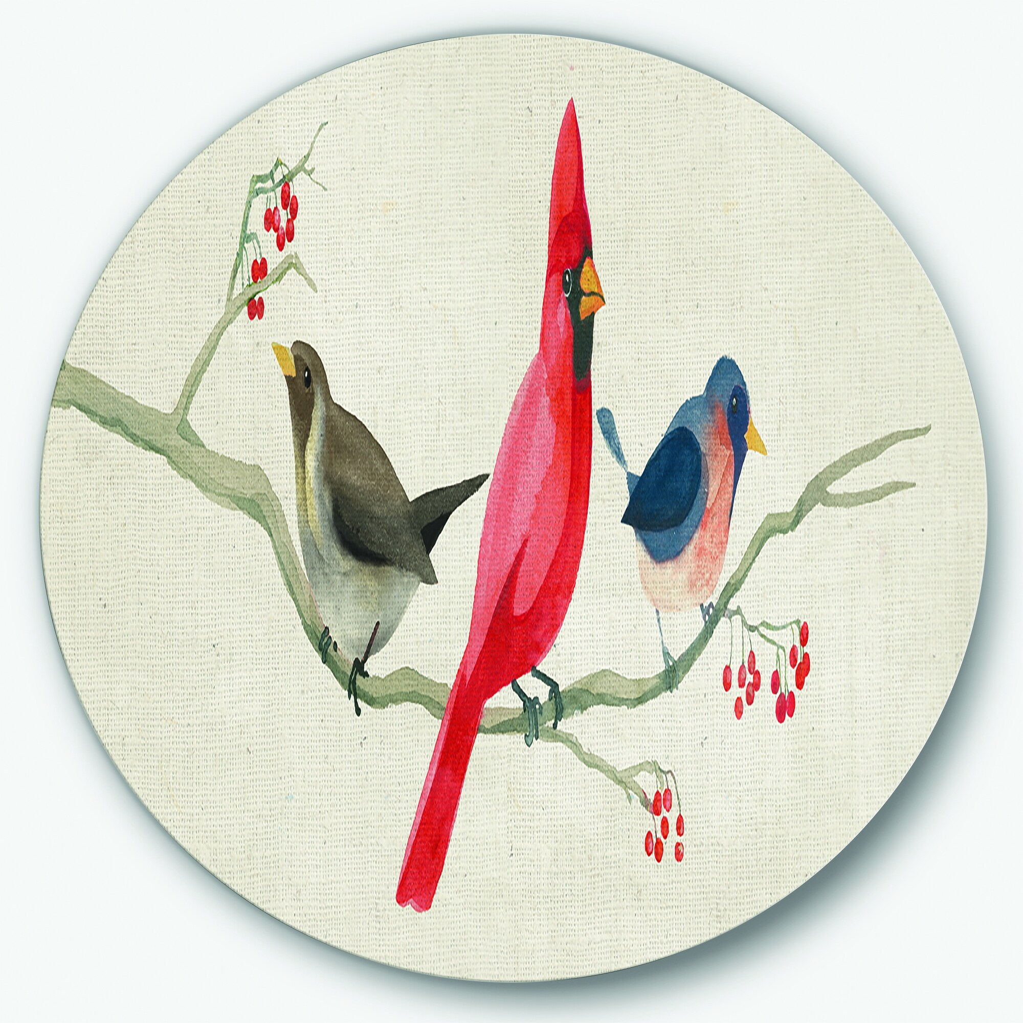 Designart 'Red Farmhouse Bird on Branch ' Farmhouse Metal Circle Wall Art