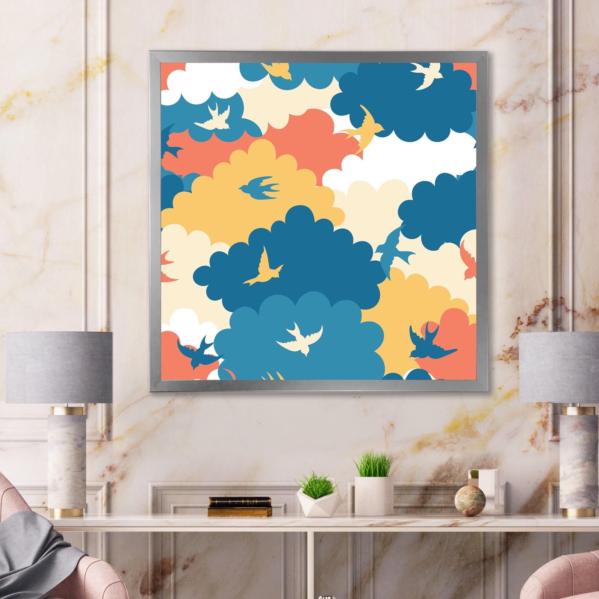 Designart "Red Blue And Yellow Clouds With Little Birds" Patterned Framed Art Print