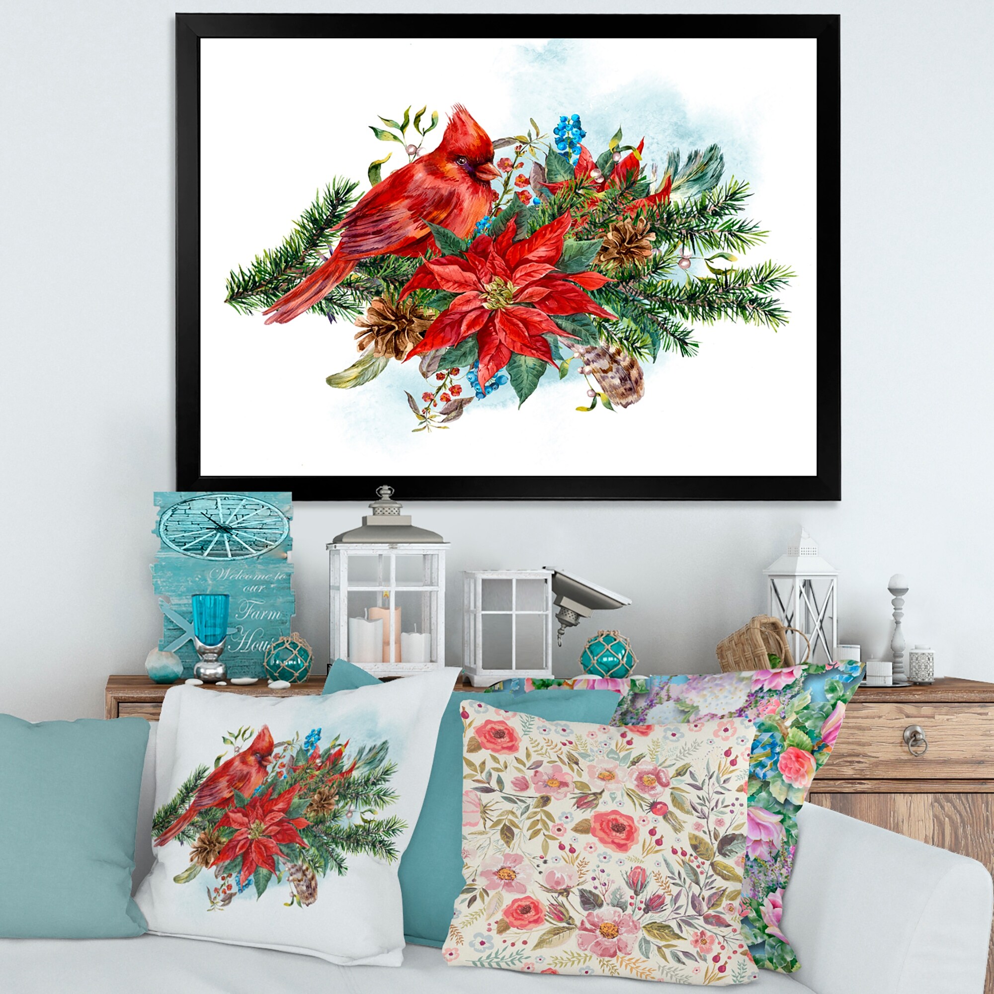 Designart "Christmas Poinsettia and Red Cardinal Bird" Traditional Framed Art Print