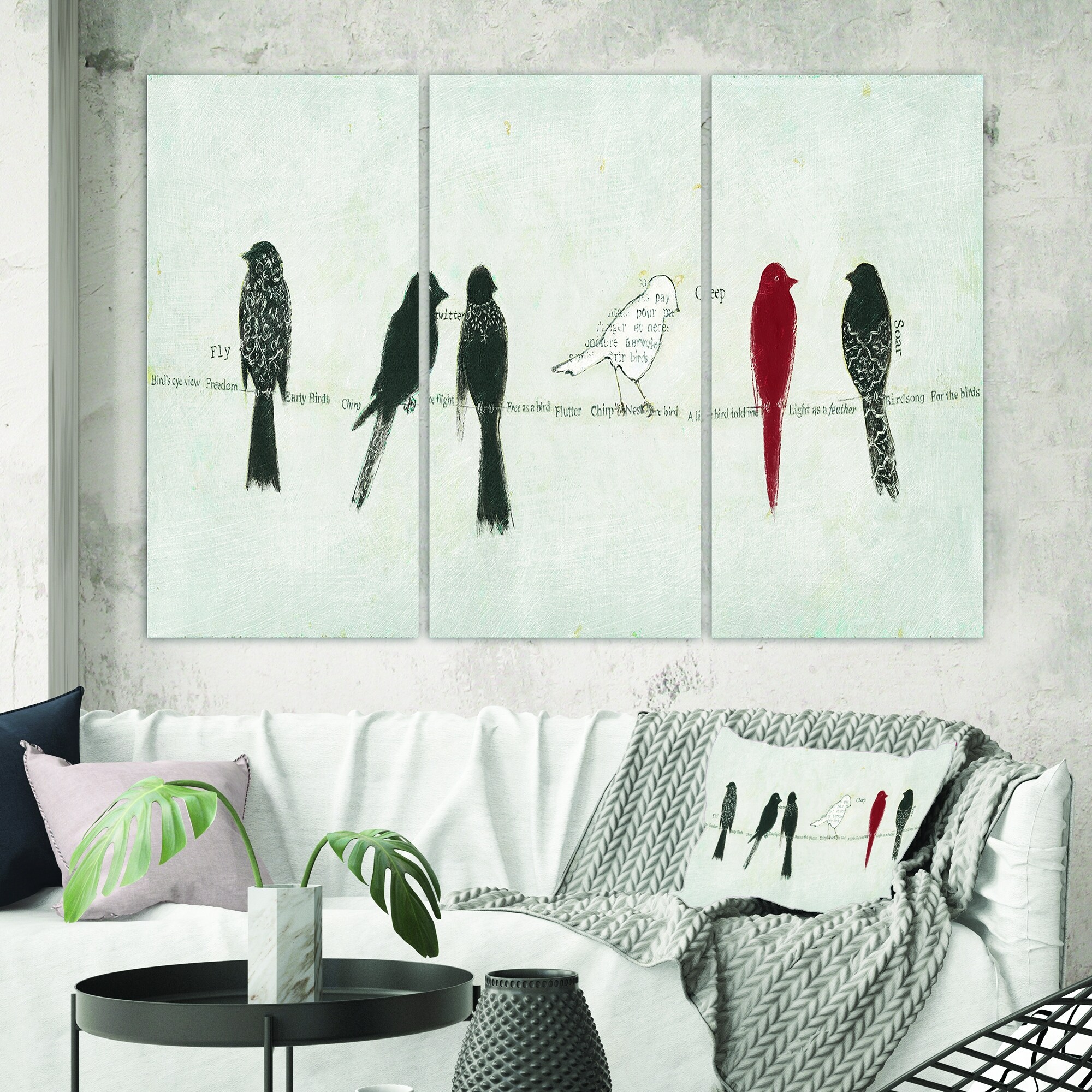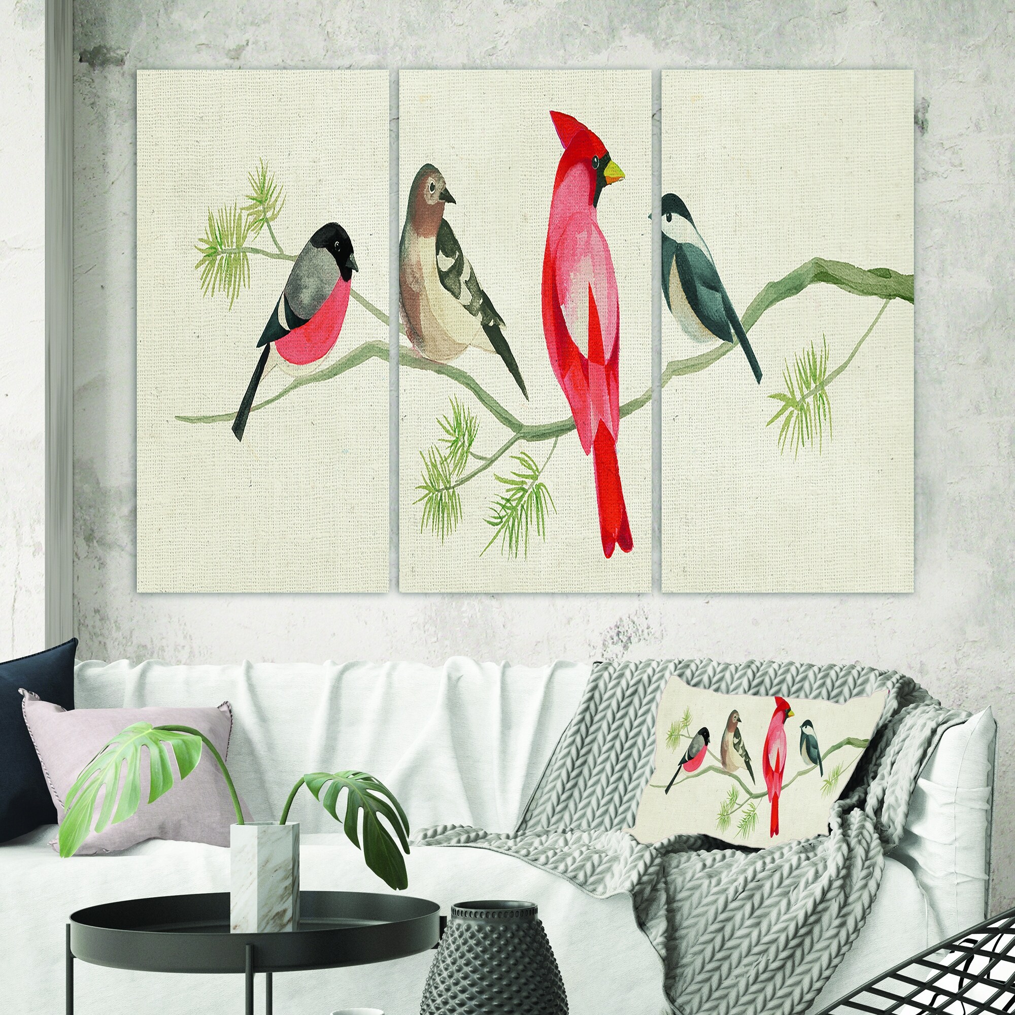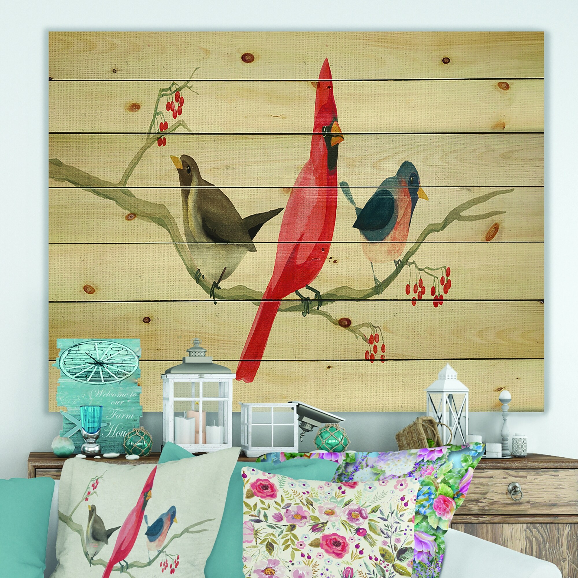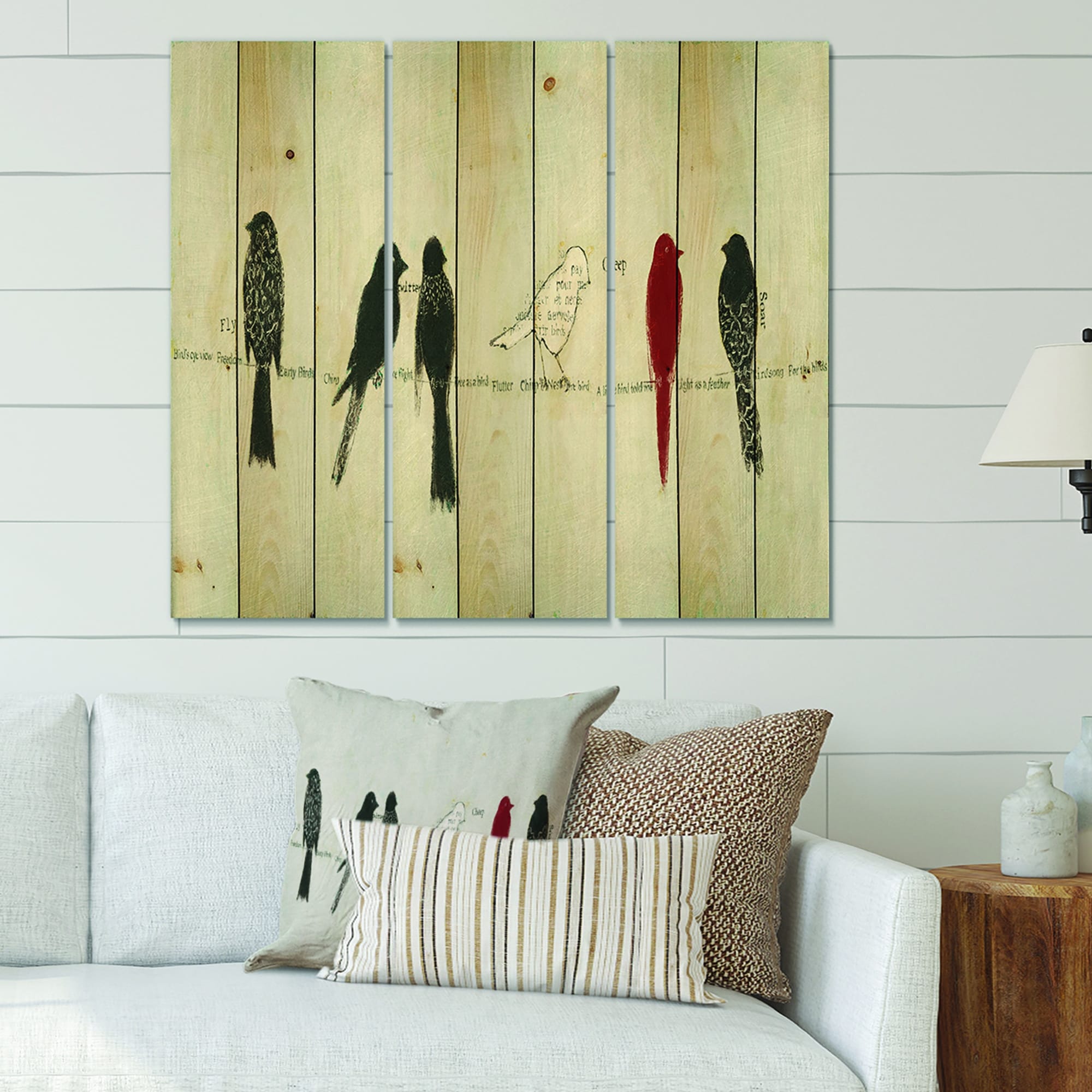 Designart 'Red Catching Up Bird Family' Farmhouse Print on Natural Pine Wood - 3 Panels
