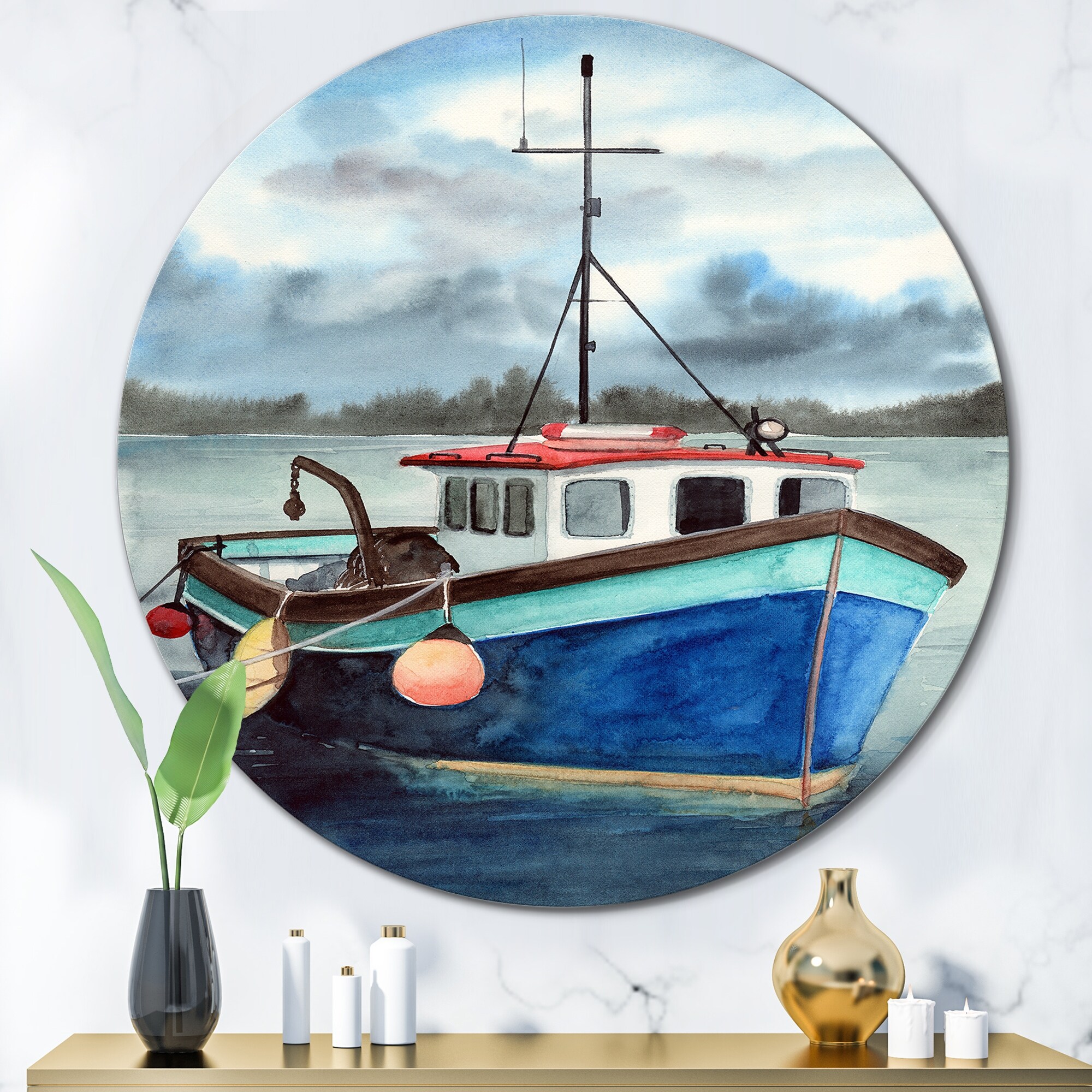 Designart 'Blue Fishing Ship With Red Roof in the Harbor' Nautical & Coastal Metal Circle Wall Art