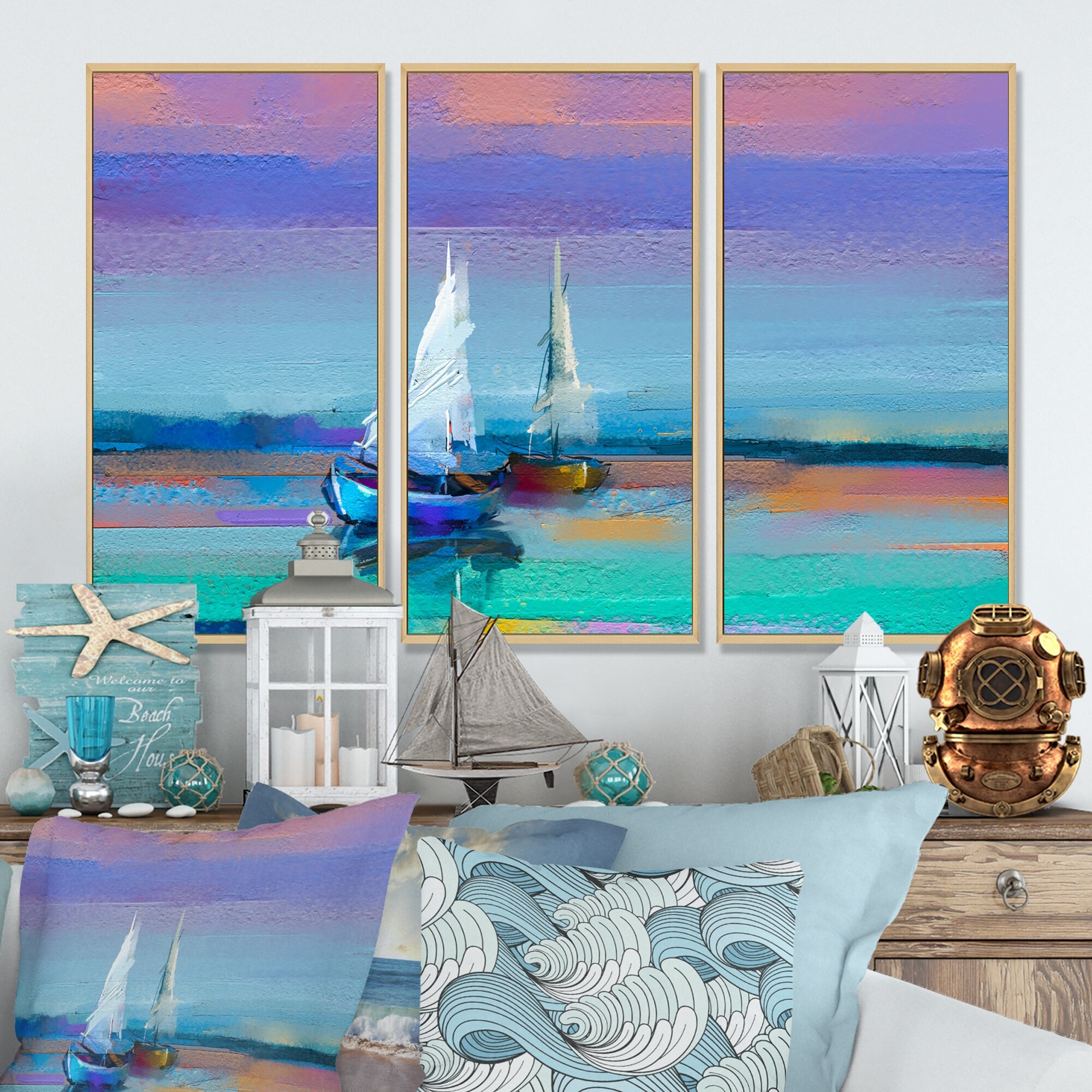 Designart "Impressionist Seascape With Little Ships II" Nautical & Coastal Framed Wall Art Set of 3 - 4 Colors of Frames