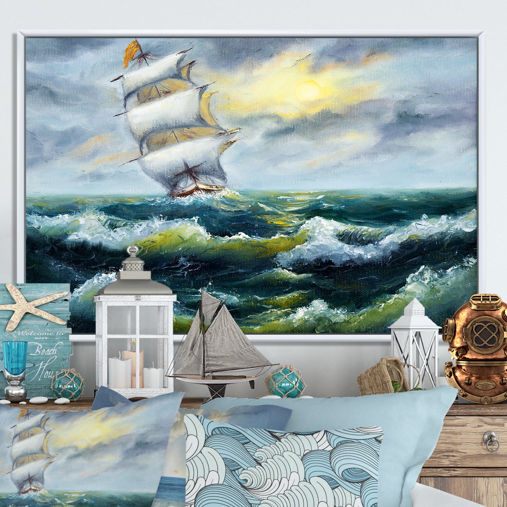 Designart "Ship On High Seas Ii" Modern Landscape Beach Framed Canvas Art Print