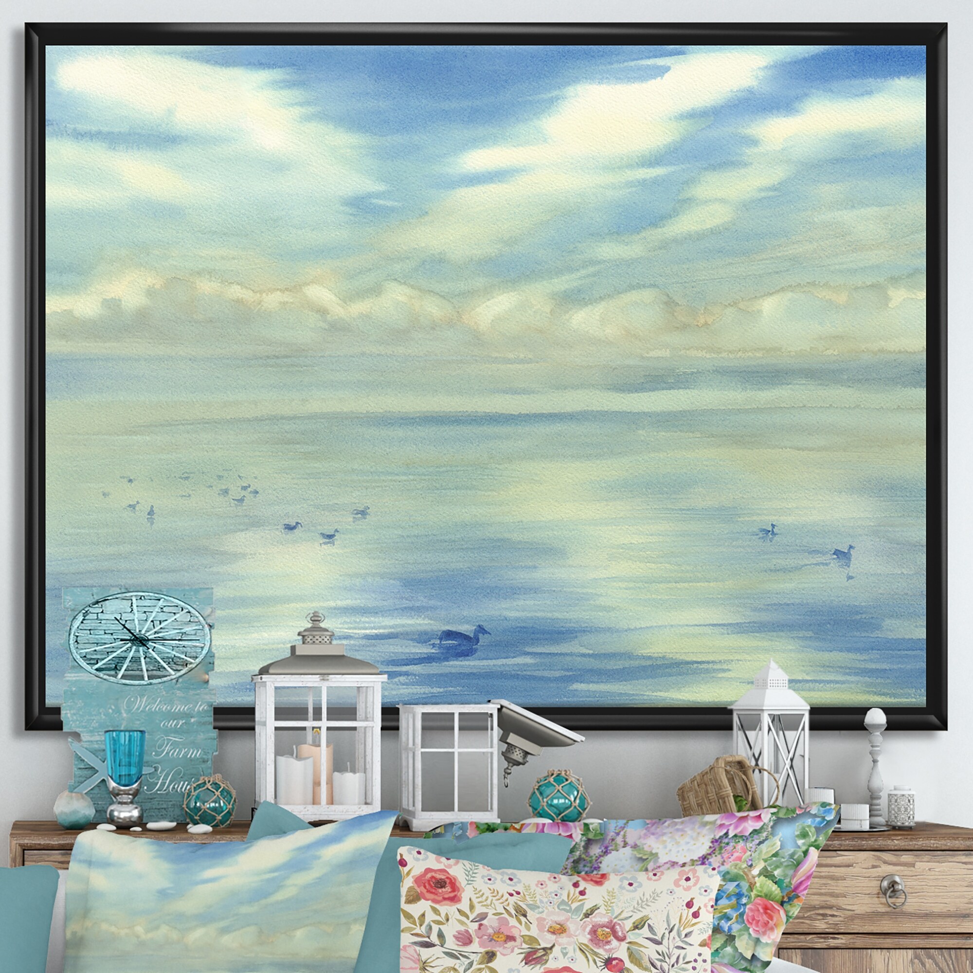Designart "Silent Morning Clouds on Ocean" Lakehouse Framed Canvas Wall Art Print