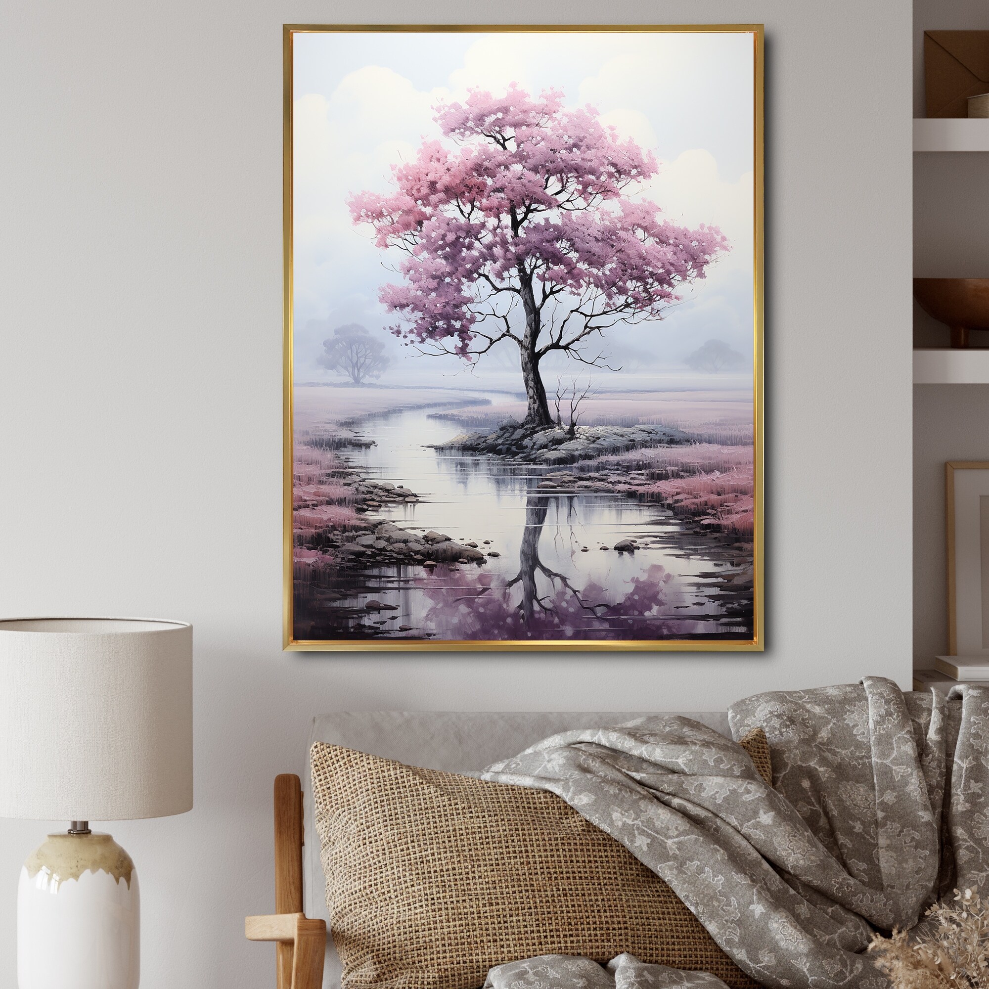 Designart "Pink Tree Silent Whispers" Tree Monochrome Framed Canvas Wall Art