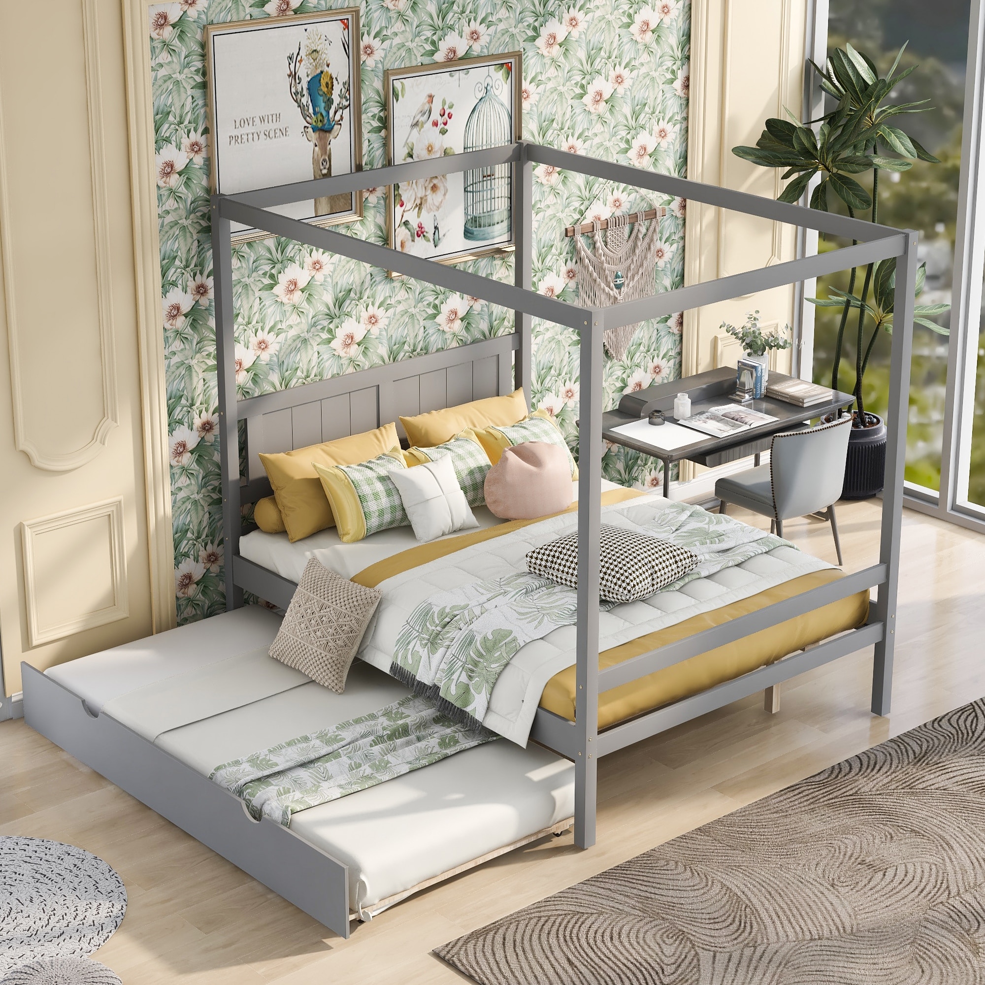 Full Size Canopy Platform Bed with Trundle, Slat Support