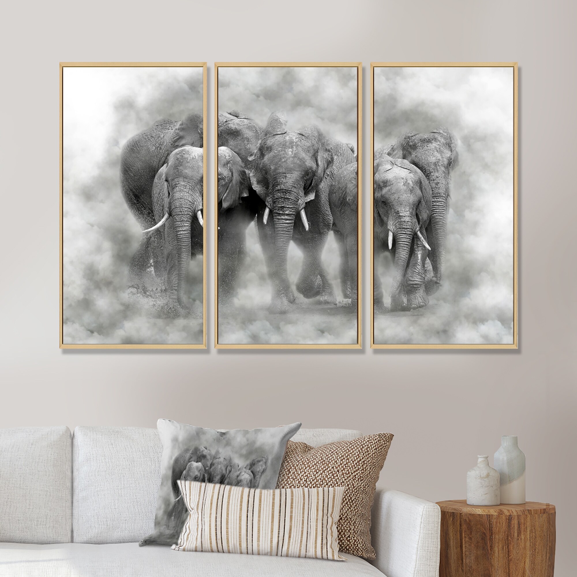 Designart "Three Elephant Kenya National Park in smoke" Animal Framed Art Set of 3 - 4 Colors of Frames