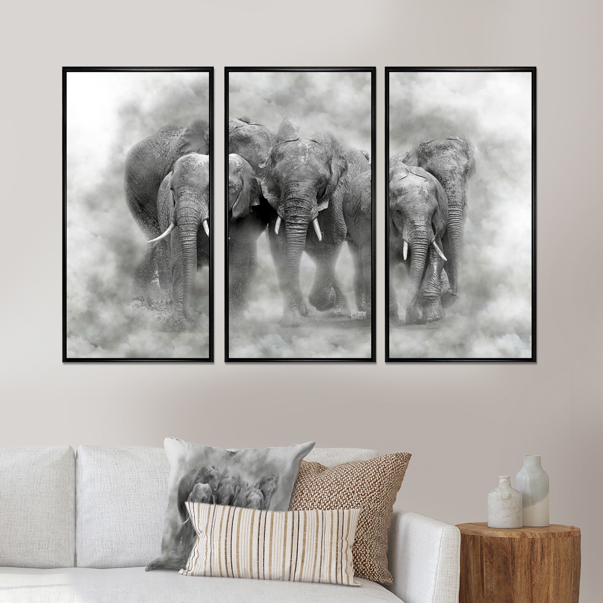 Designart "Three Elephant Kenya National Park in smoke" Animal Framed Art Set of 3 - 4 Colors of Frames