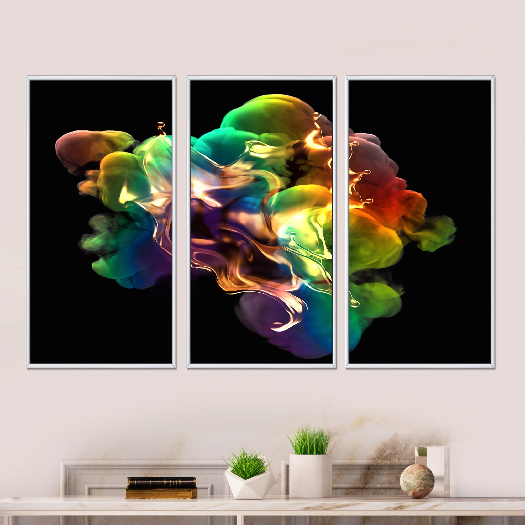 Designart "Splash Of Gold And Smoke Rainbow Color on A Black" Modern Framed Canvas Wall Art Set of 3 - 4 Colors of Frames