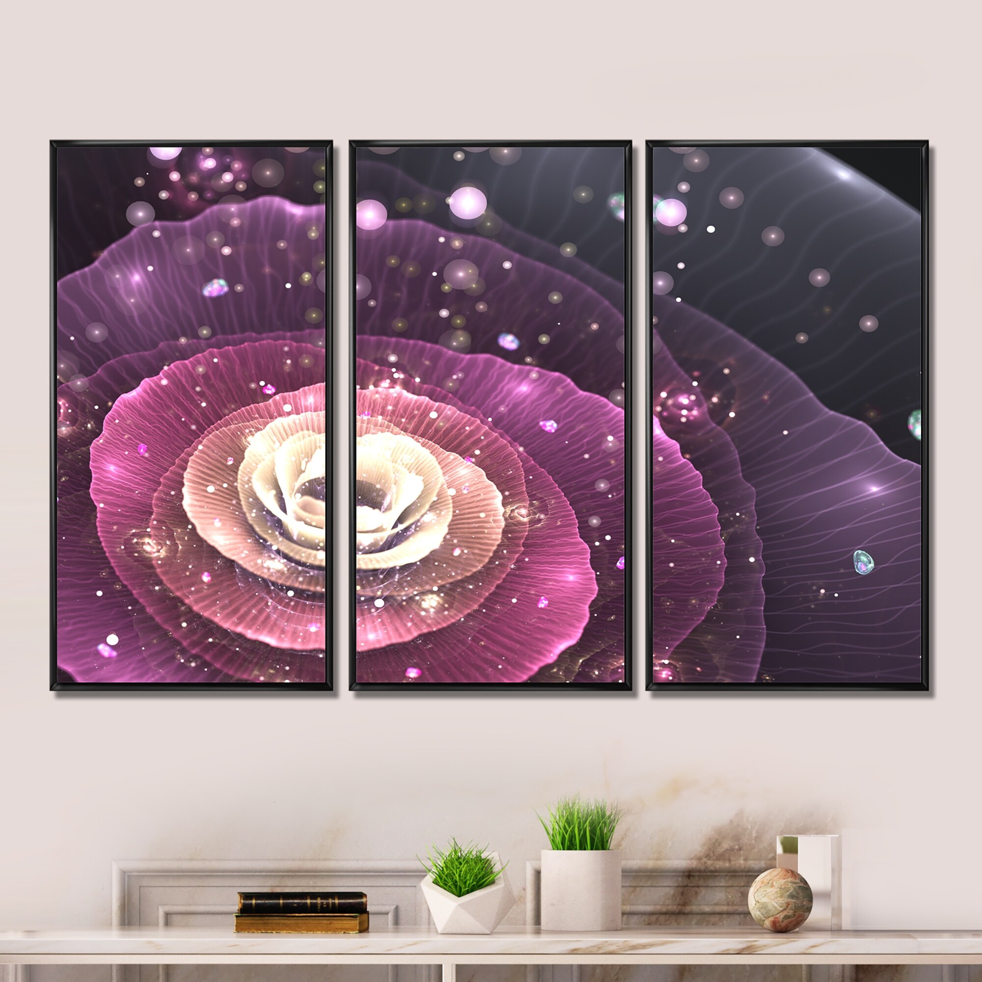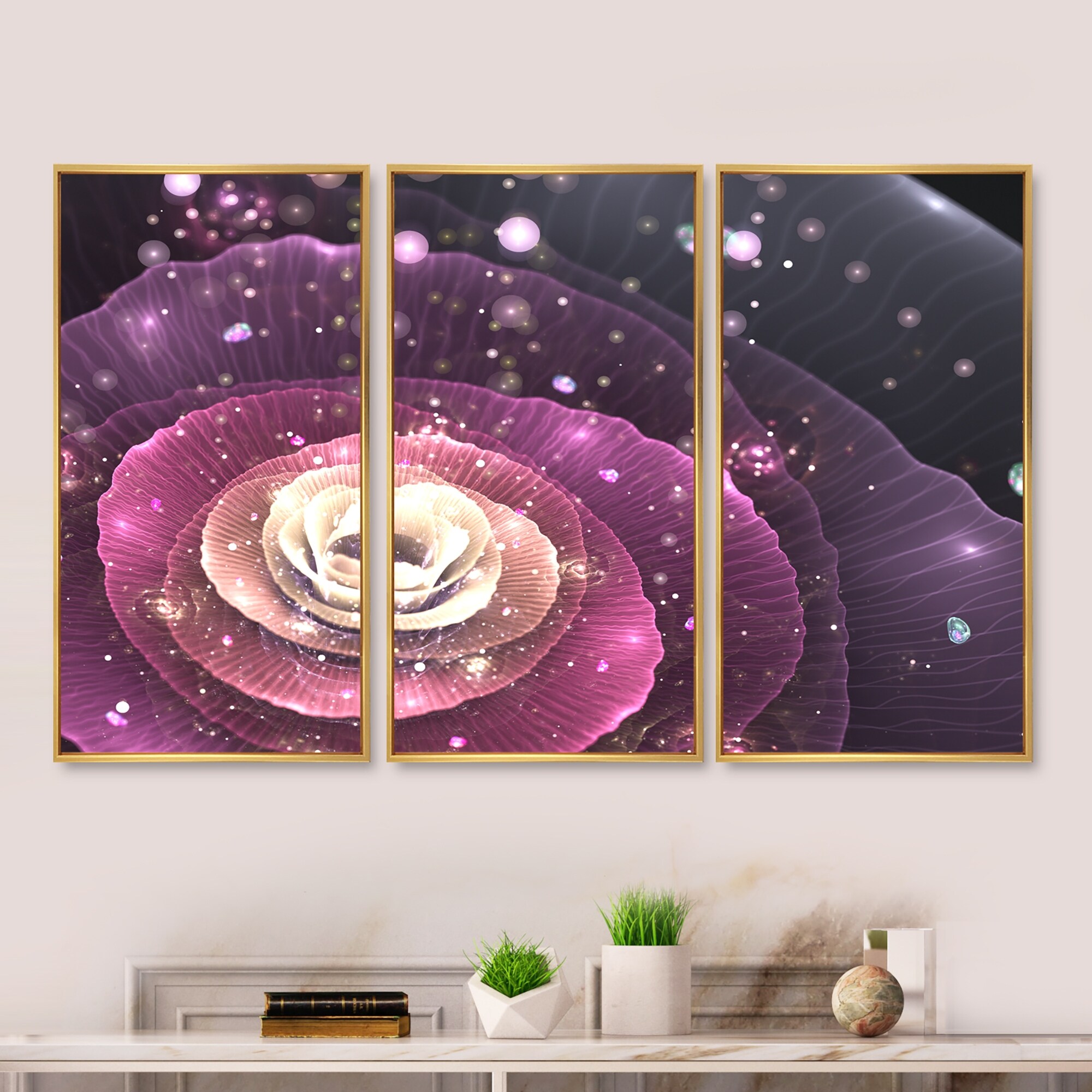 Designart "Pink Flower with Sparkles" Floral Framed Art Set of 3 - 4 Colors of Frames