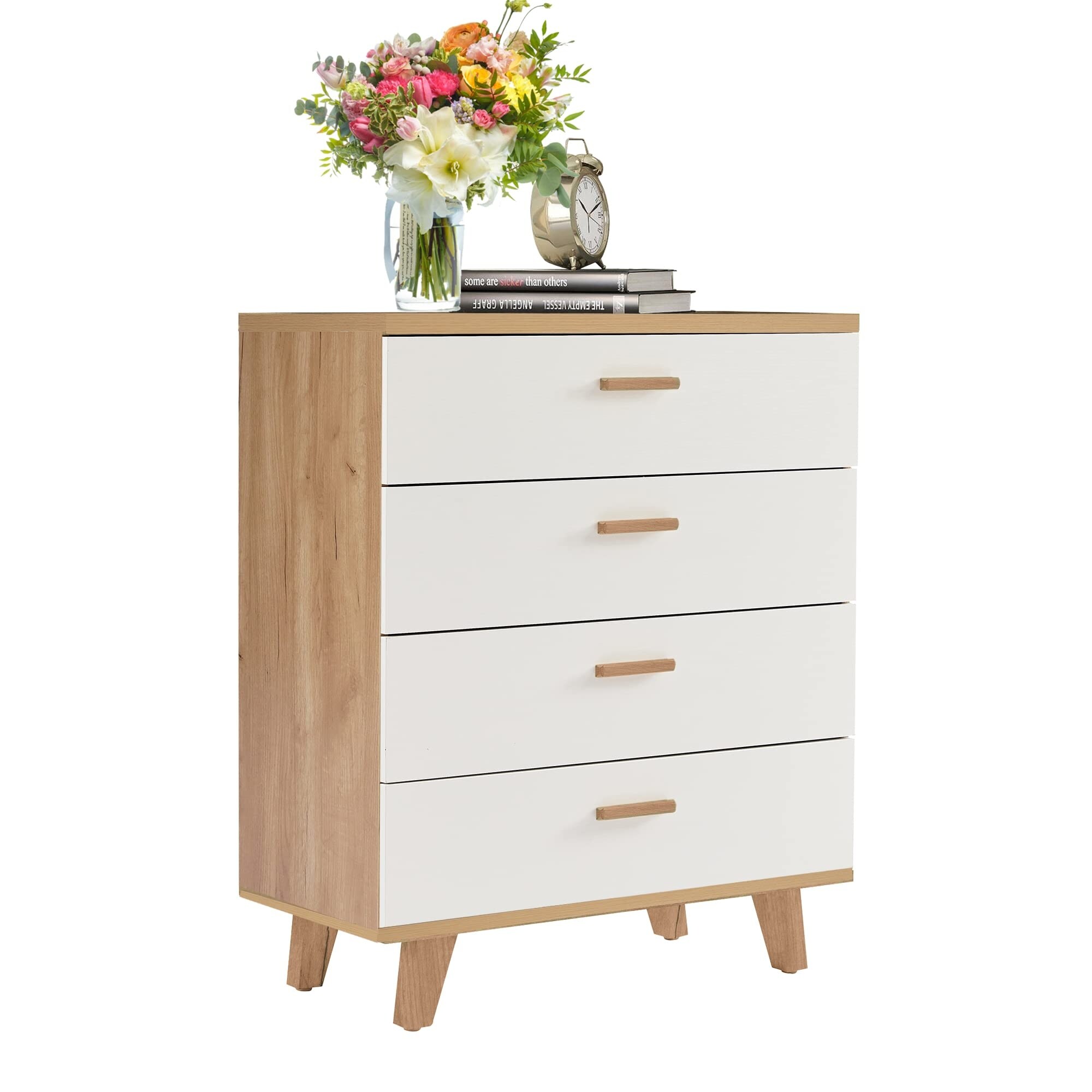 Wood 4 Drawer Dresser, Mid Century Modern Tall Dresser Storage Drawers for Bedroom, Chest of Storage Drawers, Bedside End Table