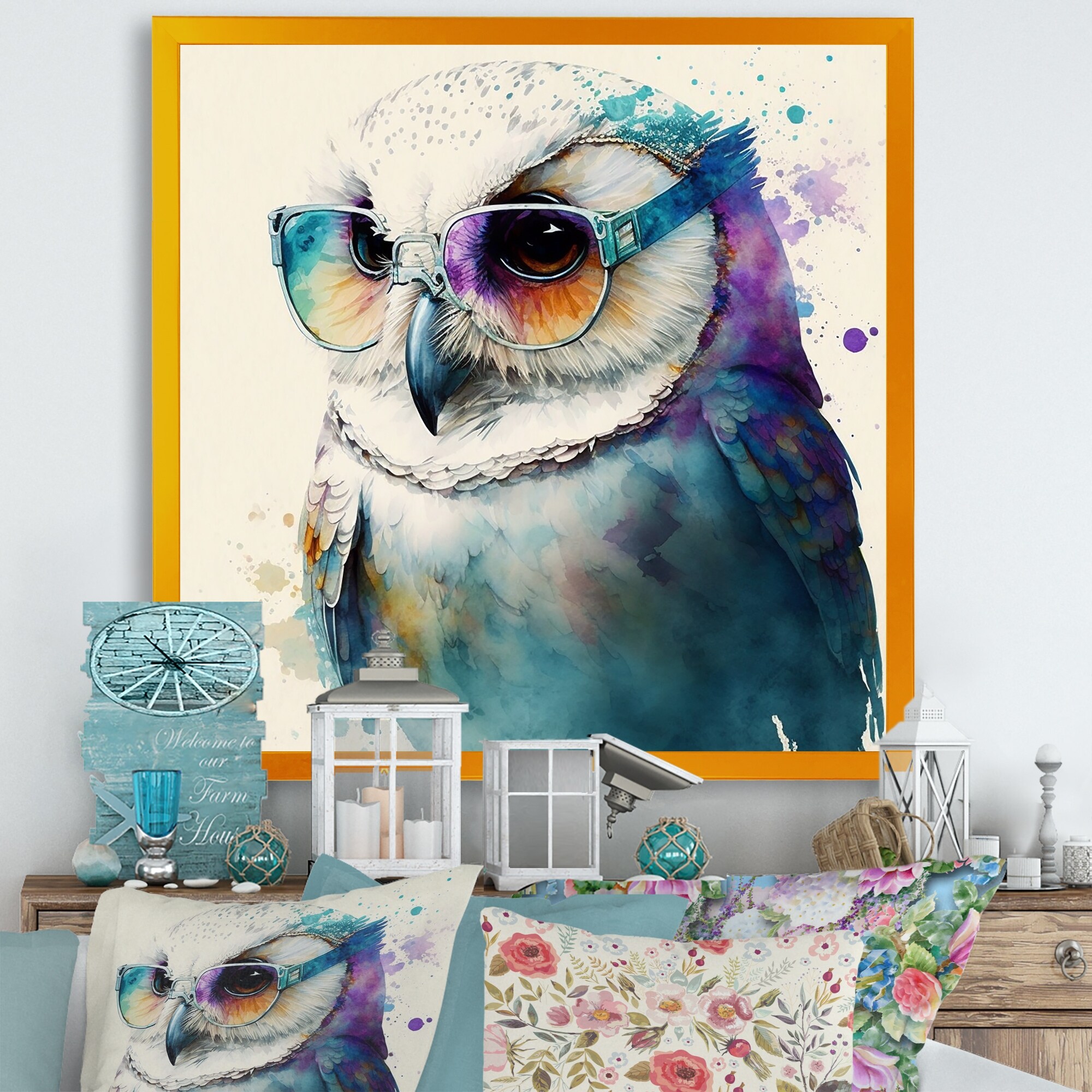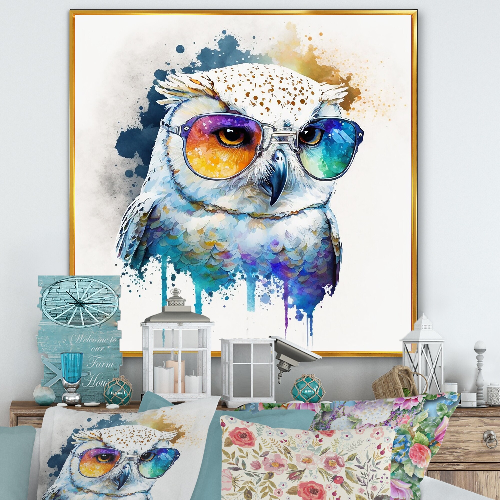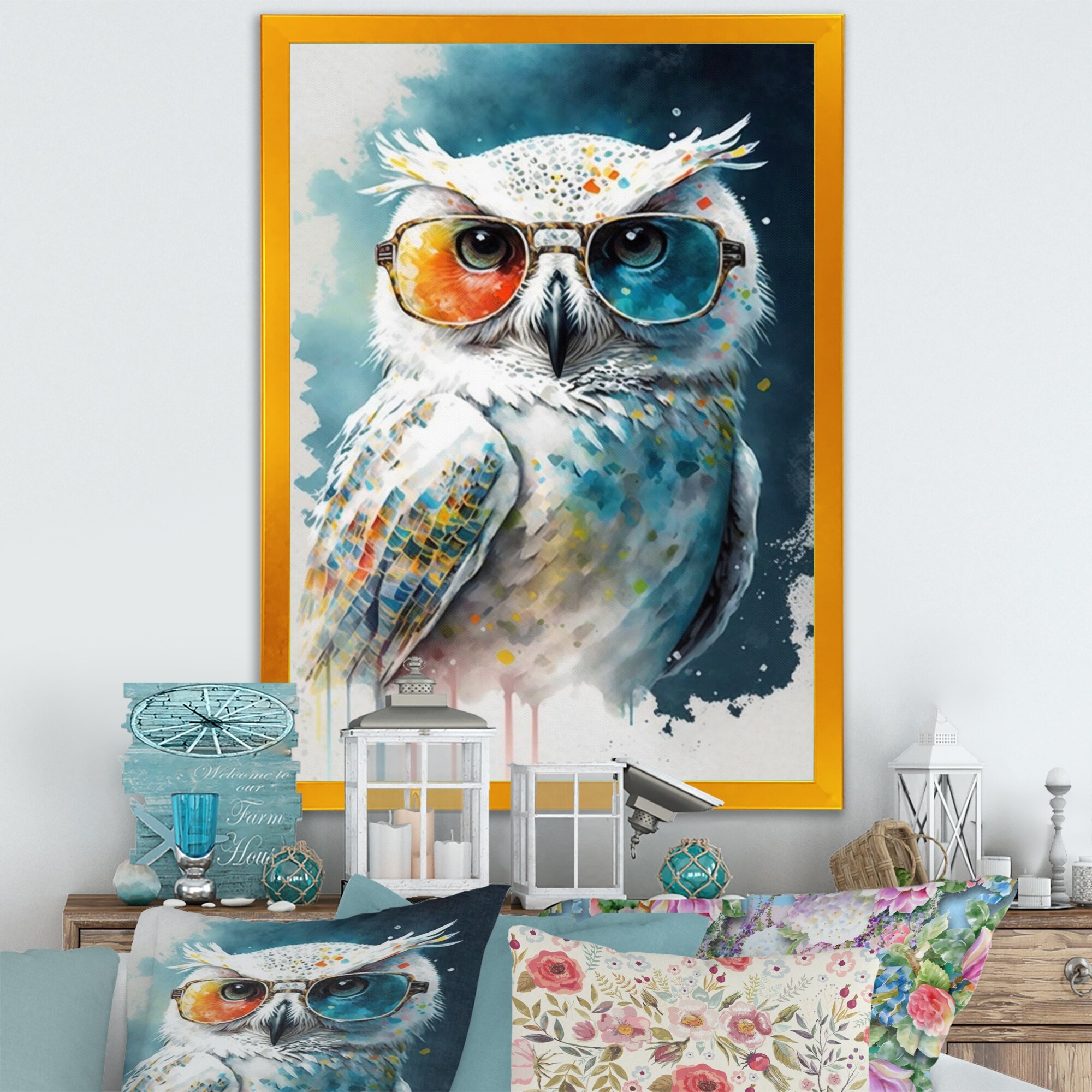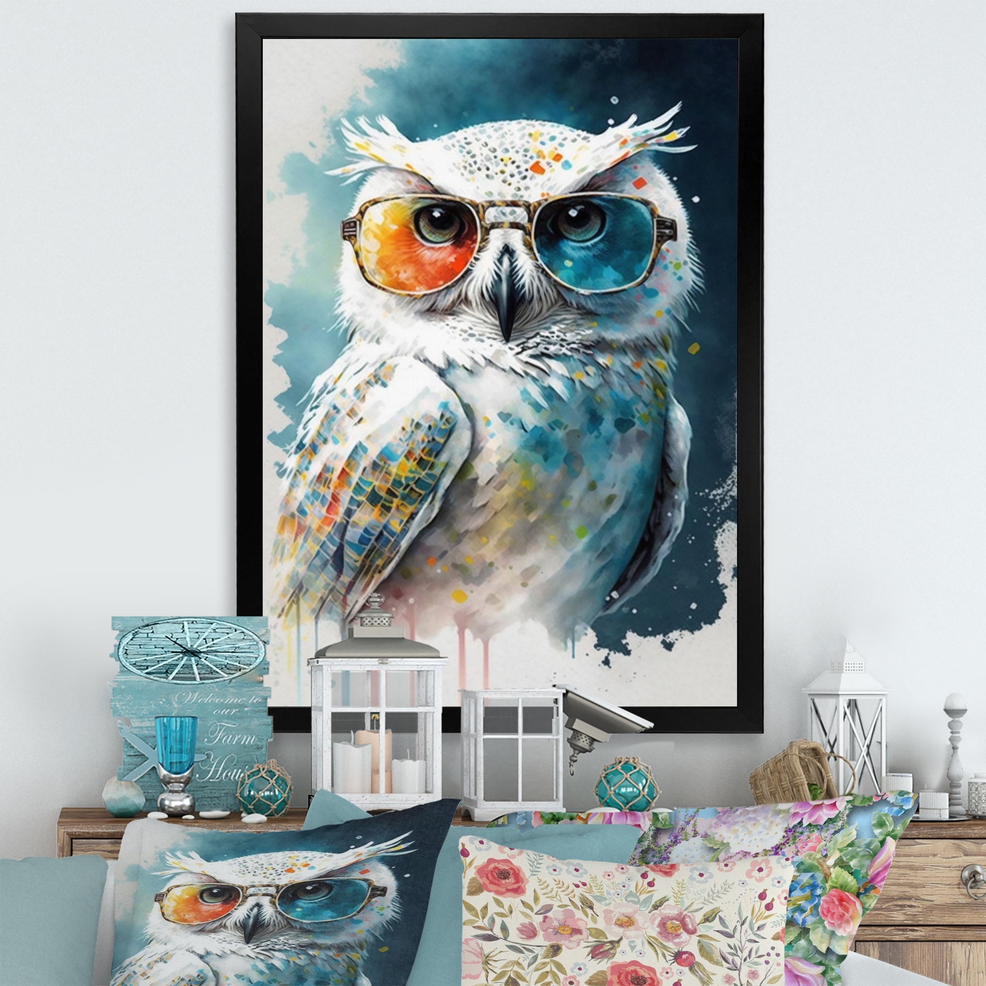 Designart "Cool White Owl With Funky Sunglasses IV" Animals Owl Framed Canvas Wall Art Print