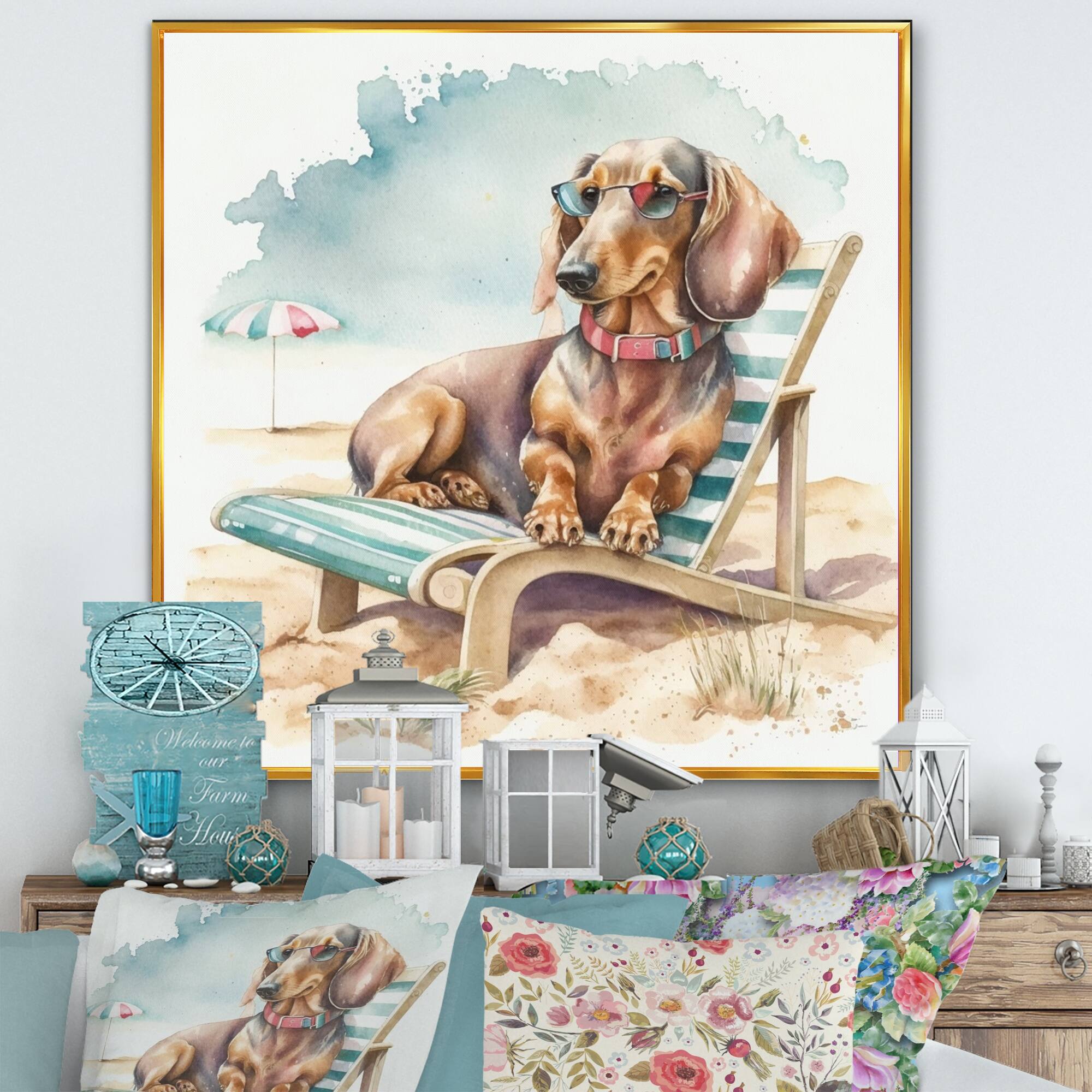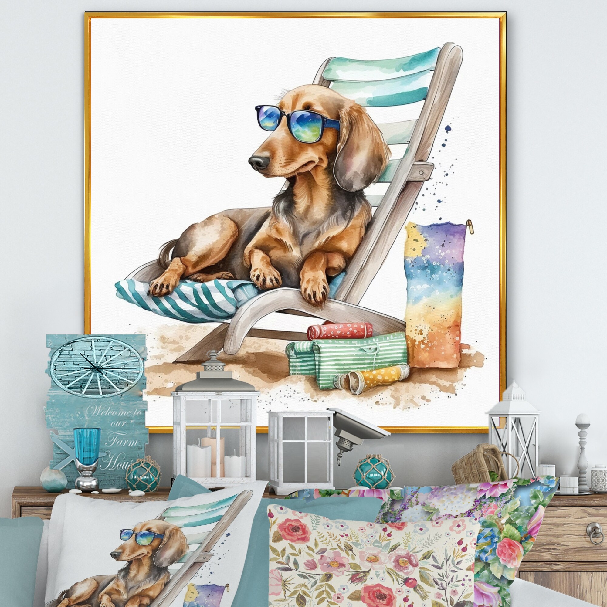 Designart "Dog Lounging on the Beach With Sunglasses III" Animals Framed Canvas Art Print