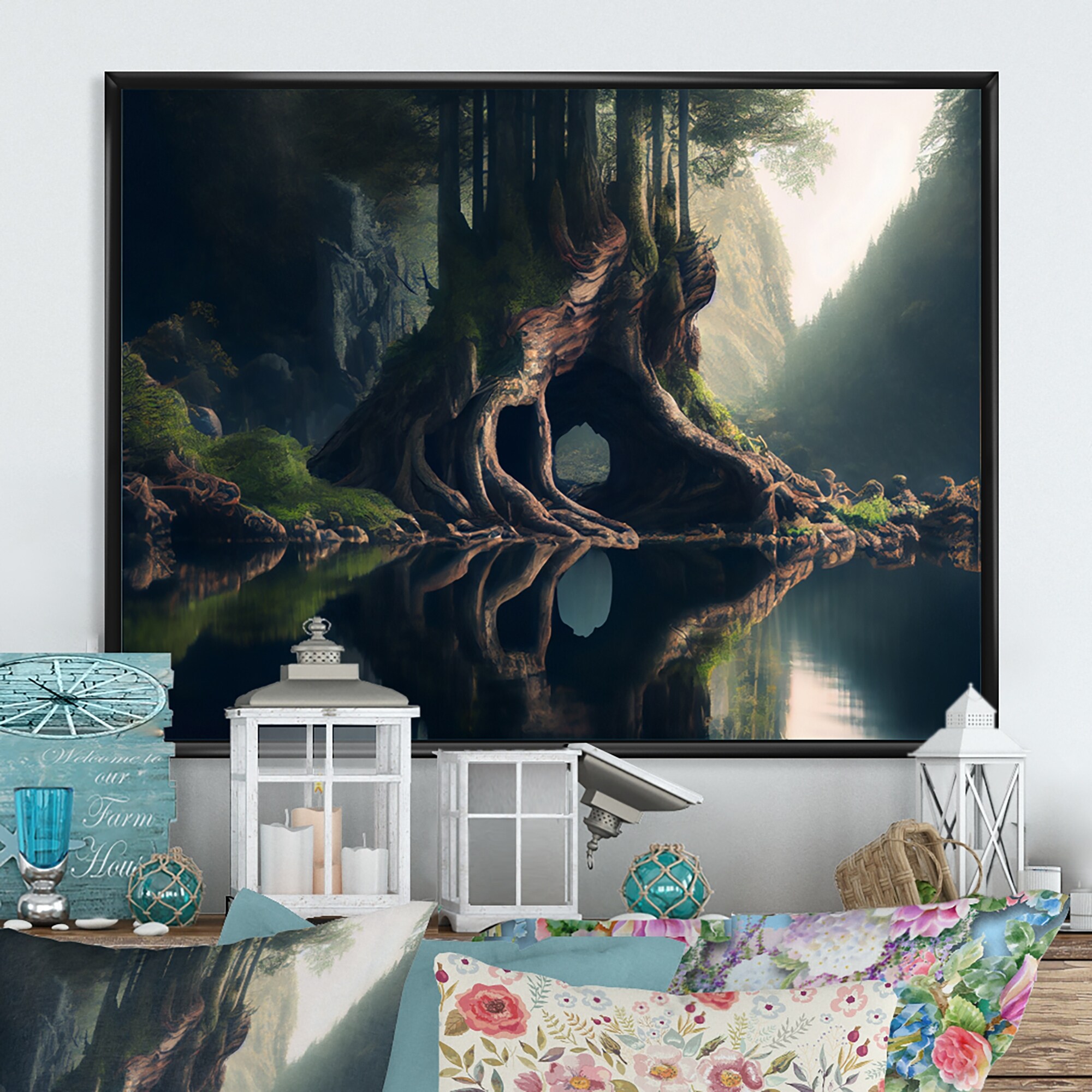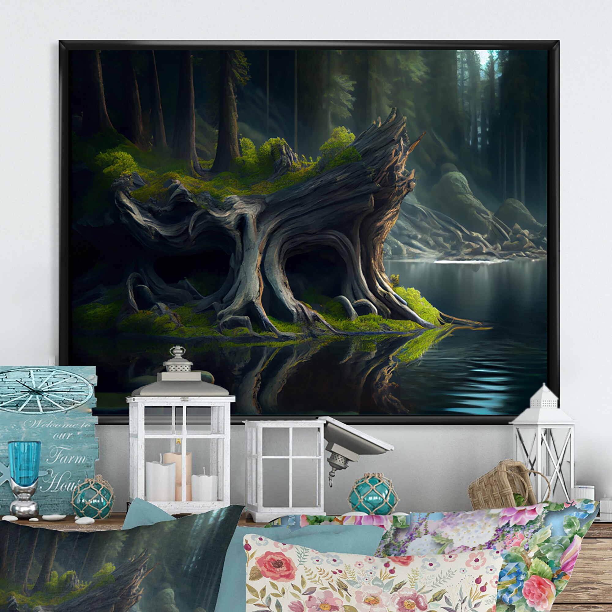 Designart "Old Majestic Tree Trunk in By the Lake I" Landscape Cottage Framed Canvas Wall Art Print