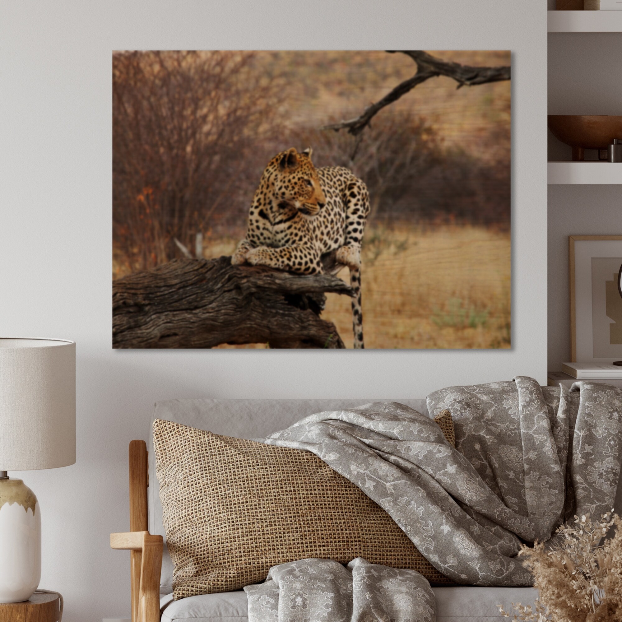 Designart 'Leopard Sitting on Tree Trunk' Traditional Wood Wall Art - Natural Pine Wood