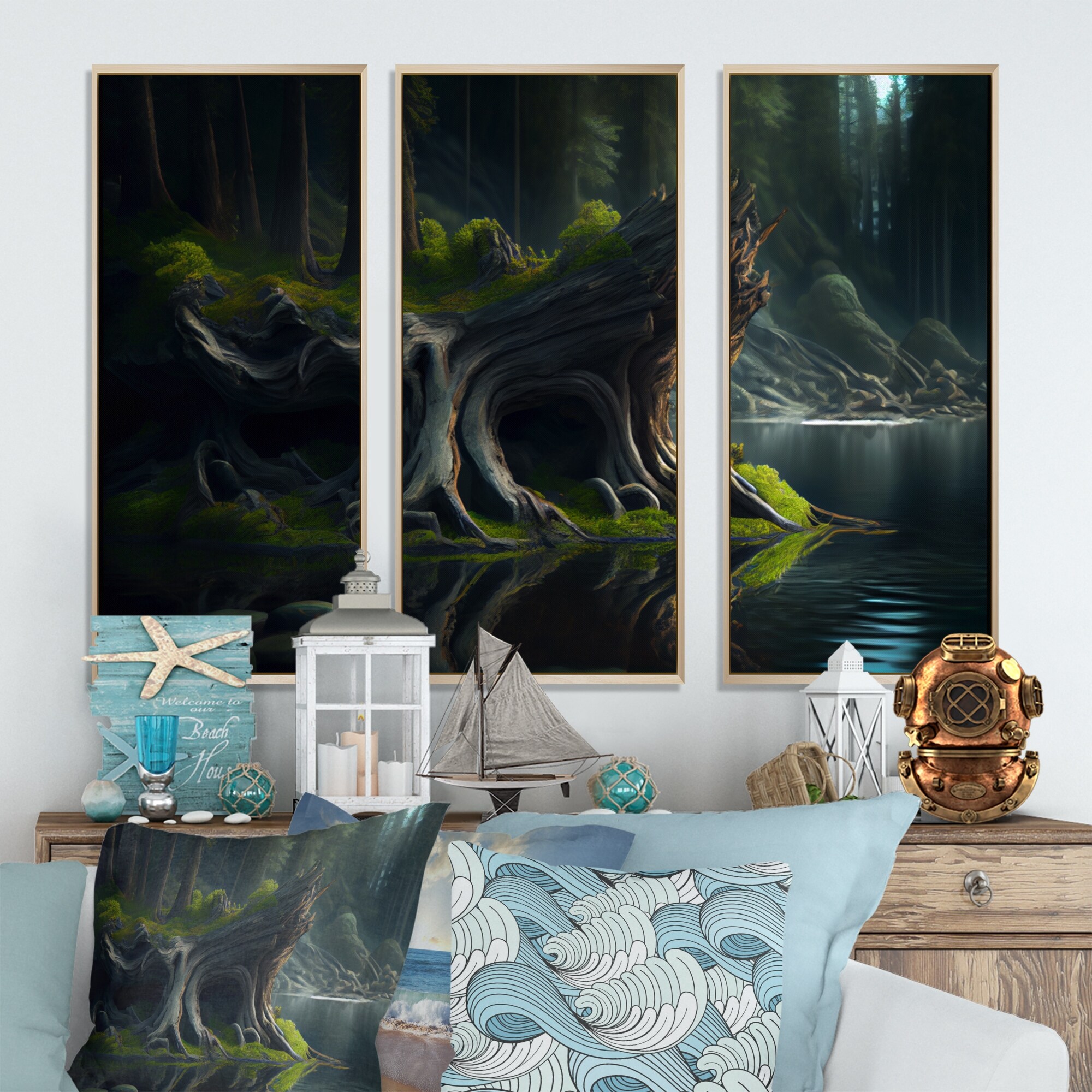 Designart "Old Majestic Tree Trunk in By the Lake I" Landscape Cottage Framed Canvas Wall Art Print - 3 Panels
