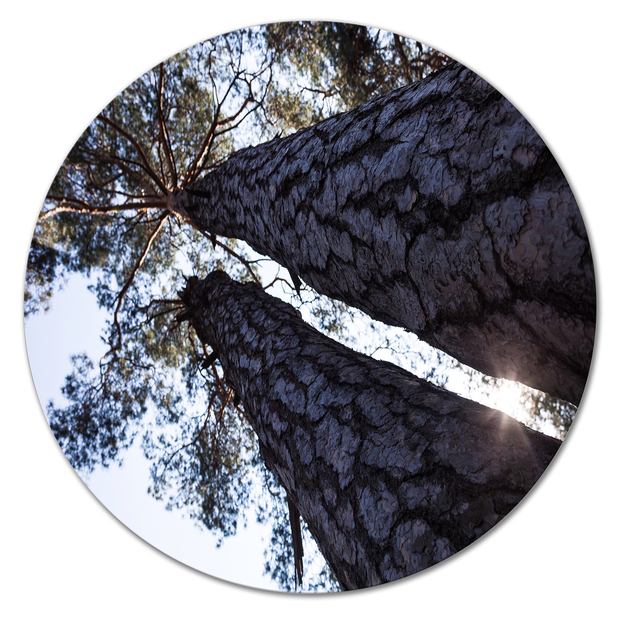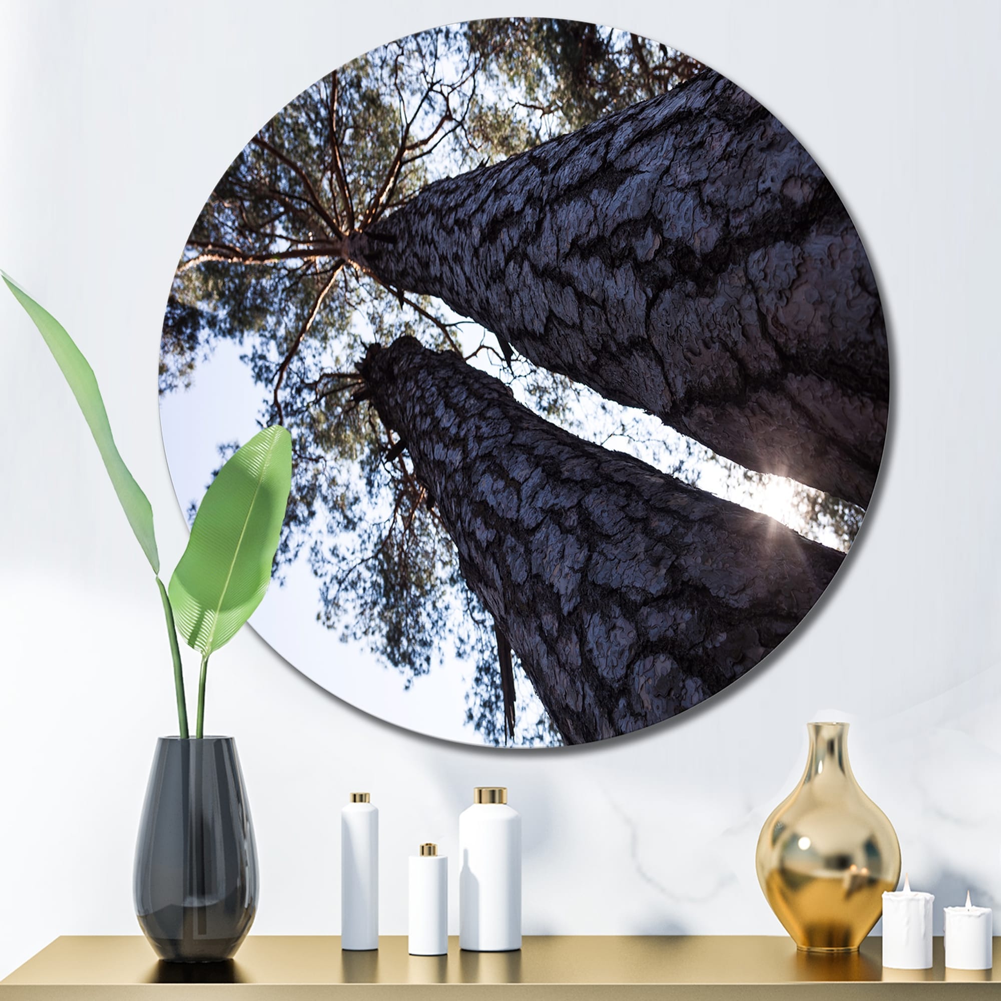 Designart 'Silhouettes Of Two Thick Pine Tree Trunks And Tops' Tropical Metal Circle Wall Art