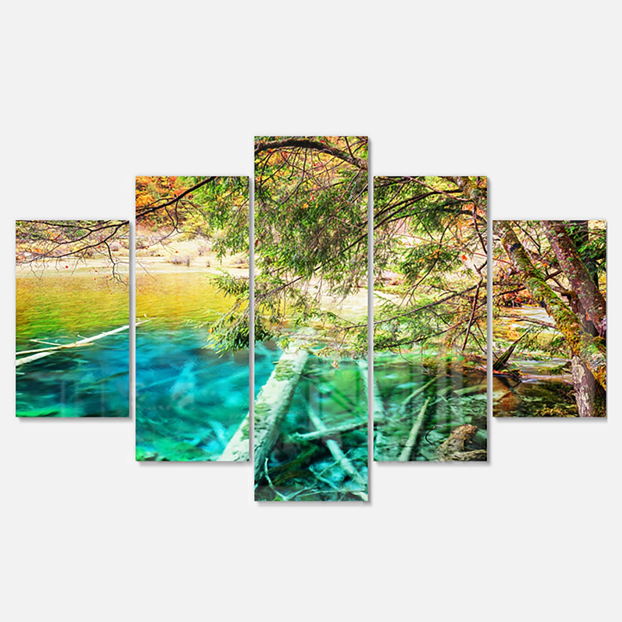 Designart "Colorful Lake with Tree Trunks" Landscape Canvas Wall Art