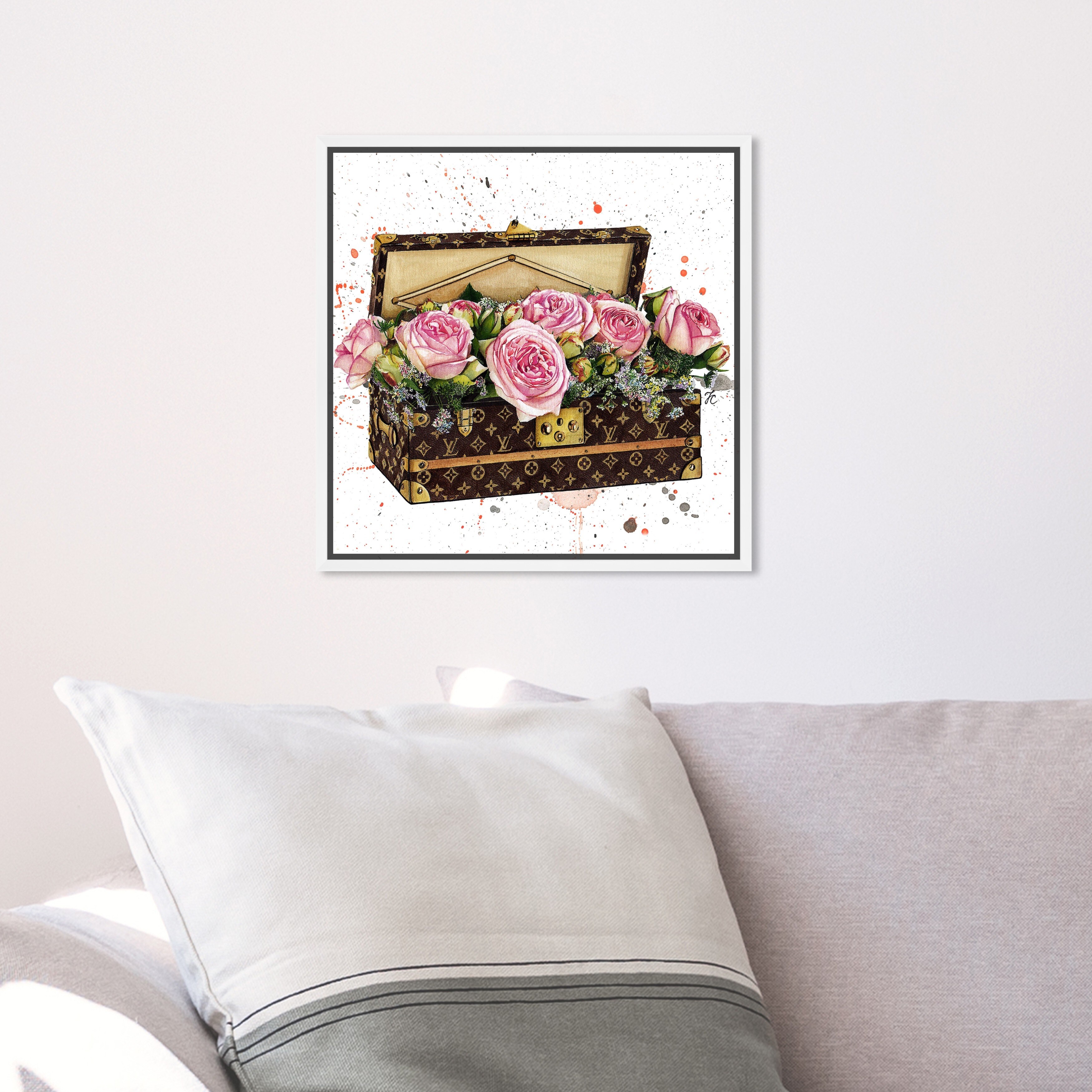 Oliver Gal Fashion and Glam Wall Art Framed Canvas Prints 'Doll Memories Trunk Full of Flowers' Travel Essentials - Pink, Brown