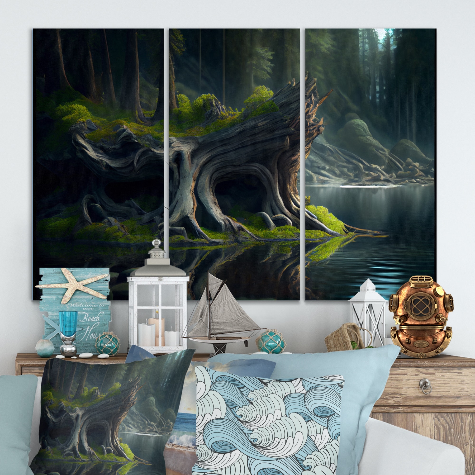 Designart "Old Majestic Tree Trunk in By the Lake II" Landscape Cottage Framed Canvas Wall Art Print - 3 Panels