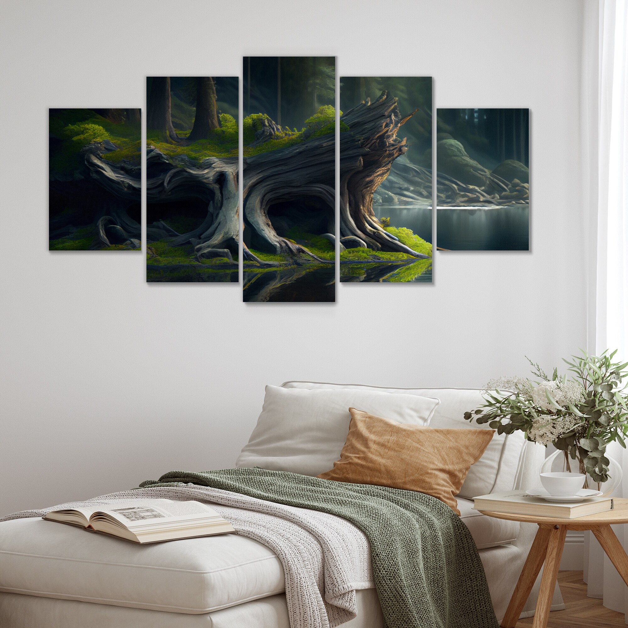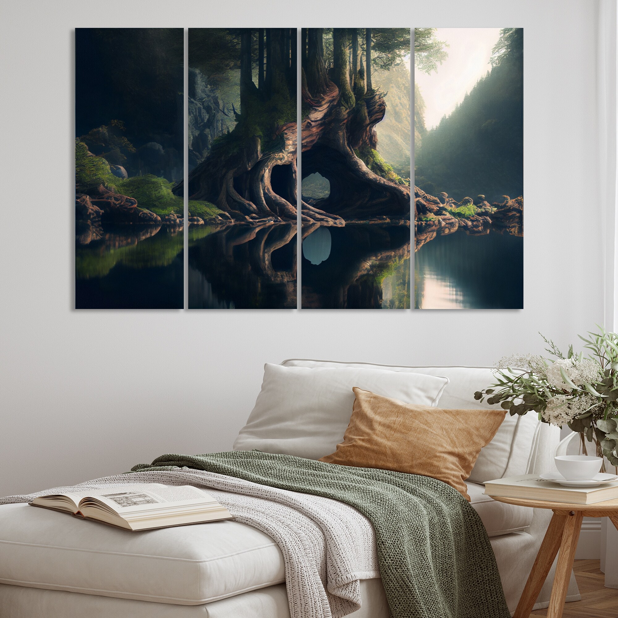 Designart "Old Majestic Tree Trunk in By the Lake II" Landscape Cottage Lake Mountains Multipanel Canvas Wall Art