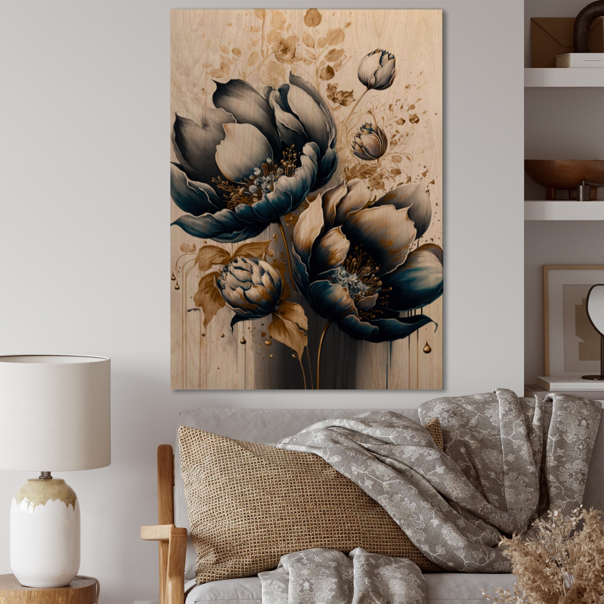 Designart 'Black And White Watercolor Roses I' Floral Tulip Wood Wall Art - Natural Pine Wood
