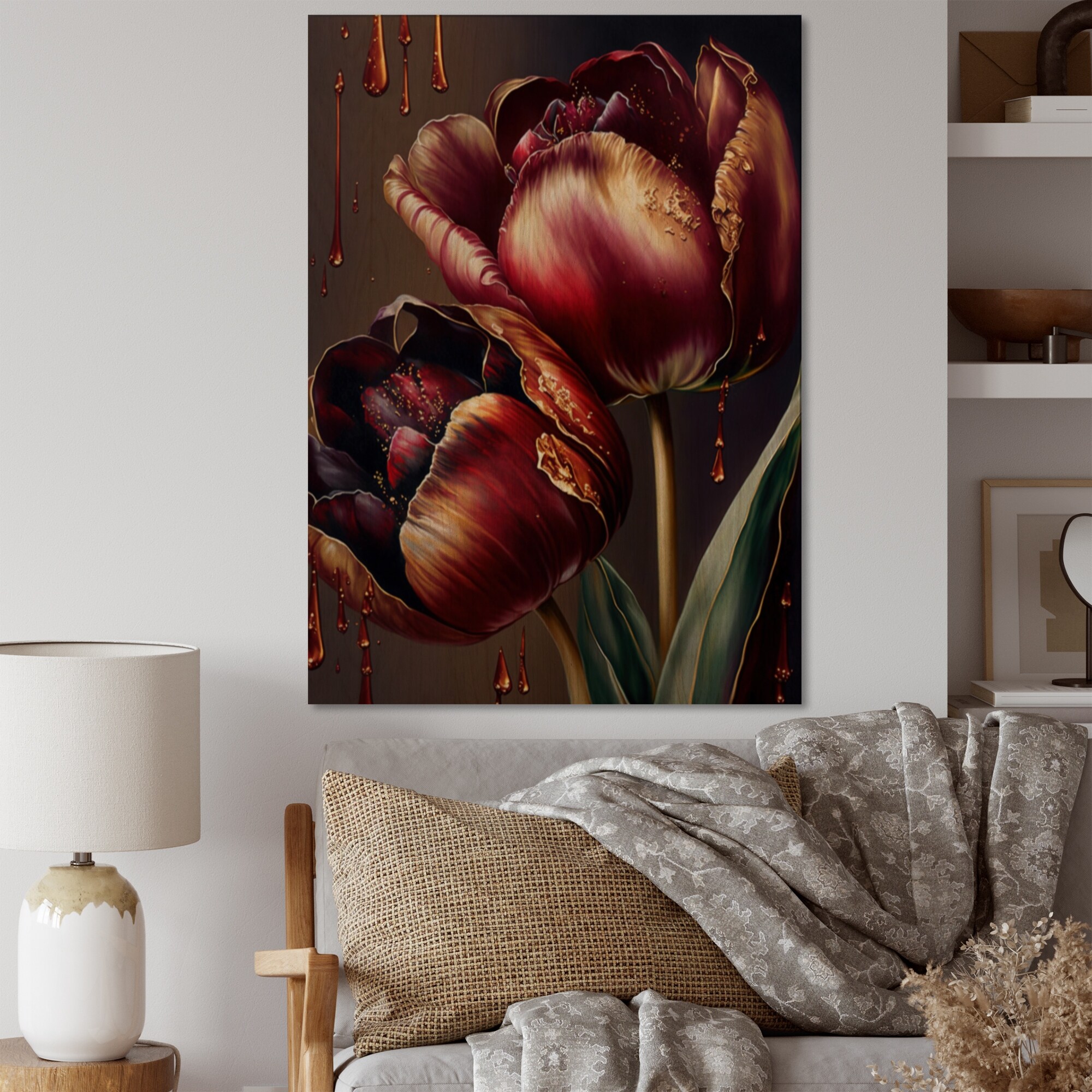 Designart 'Red And Gold Tulip II' Floral Tulip Wood Wall Art - Natural Pine Wood